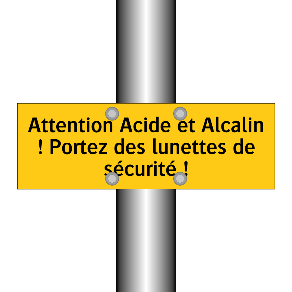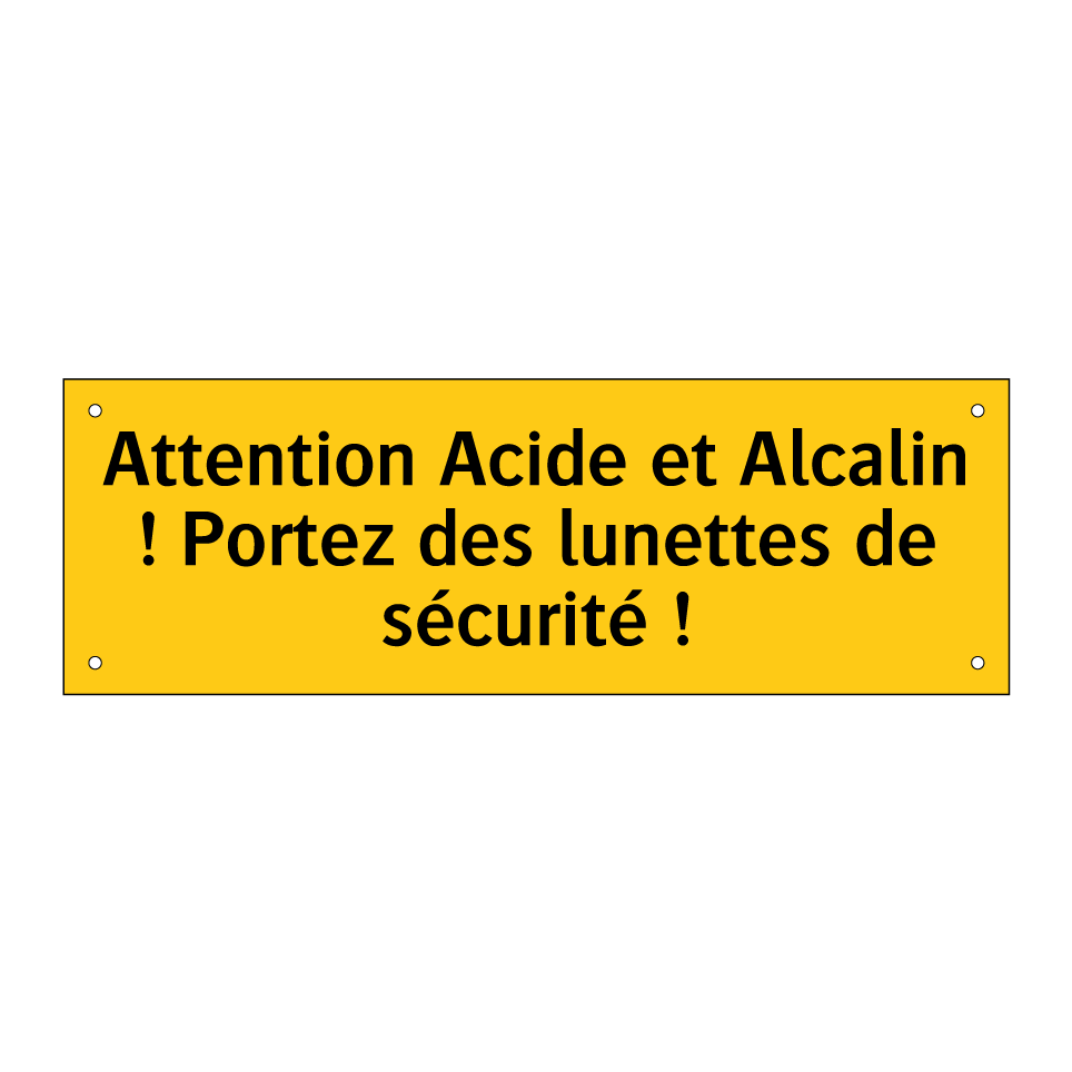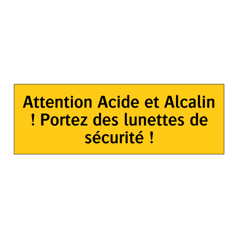 Panneau d'avertissement avec le texte : "Attention Acide et Alcalin ! Portez des lunettes de sécurité !"