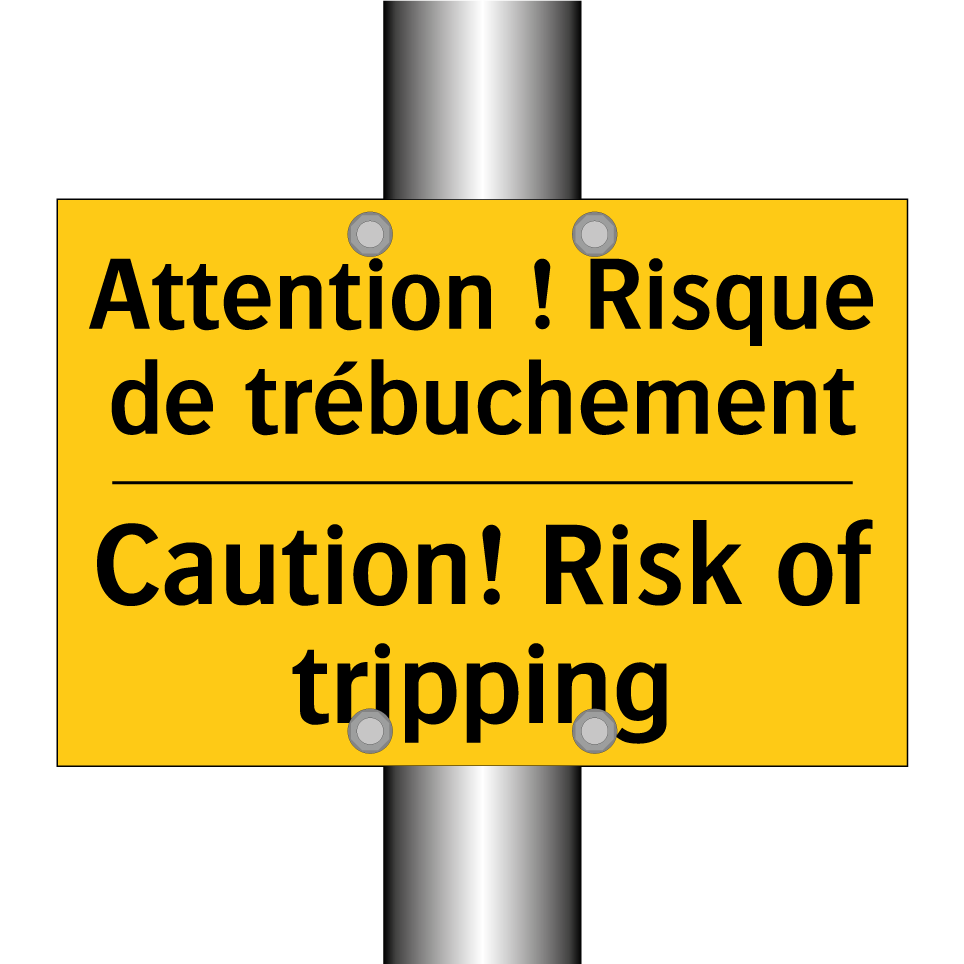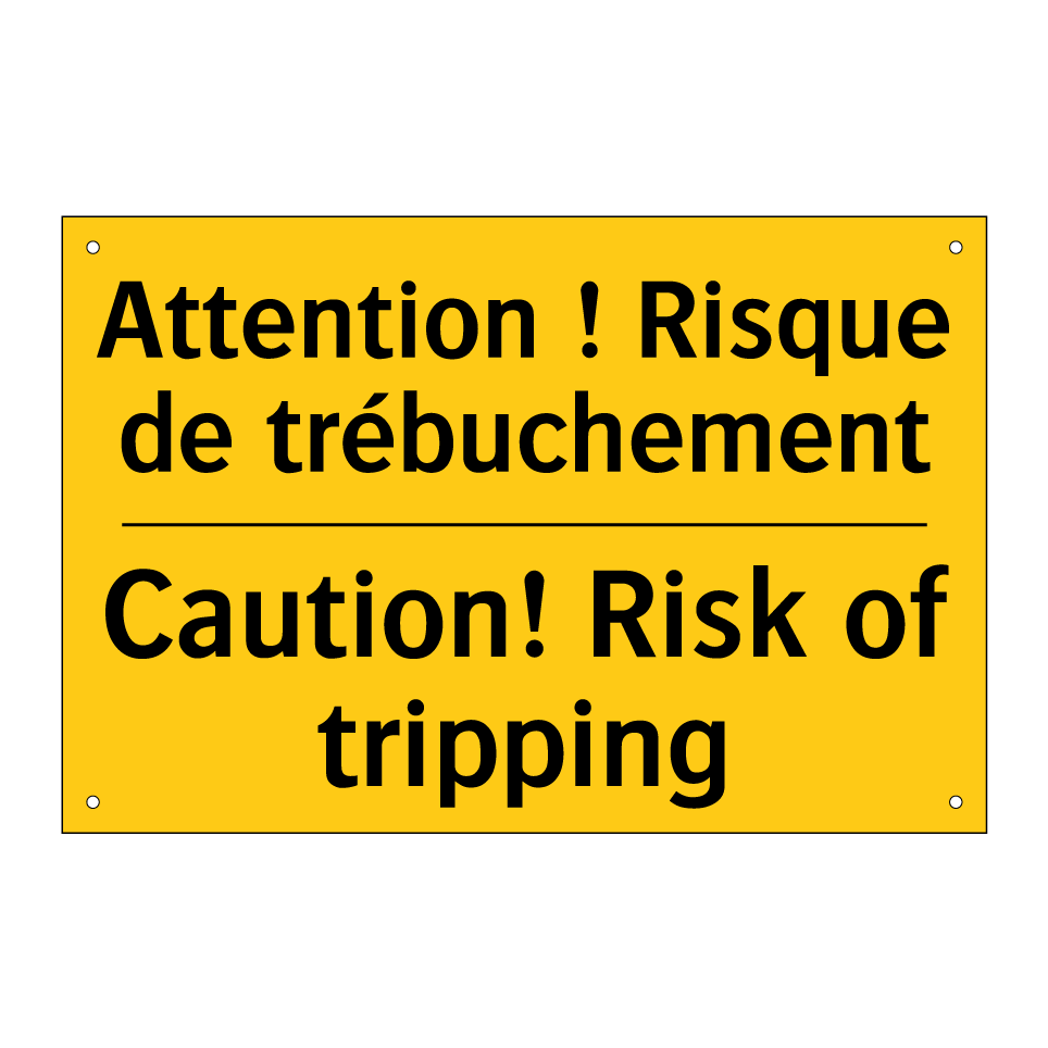 Panneau d'avertissement bilingue avec texte en français : "Attention ! Risque de trébuchement", et en anglais : "Caution! Risk of tripping"