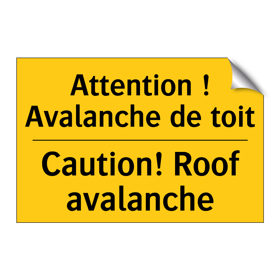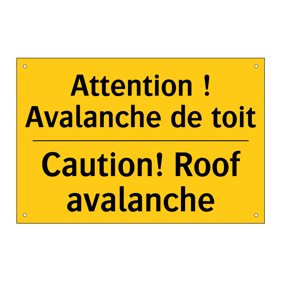 Panneau d'avertissement bilingue avec texte en français : "Attention ! Avalanche de toit", et en anglais : "Caution! Roof avalanche"