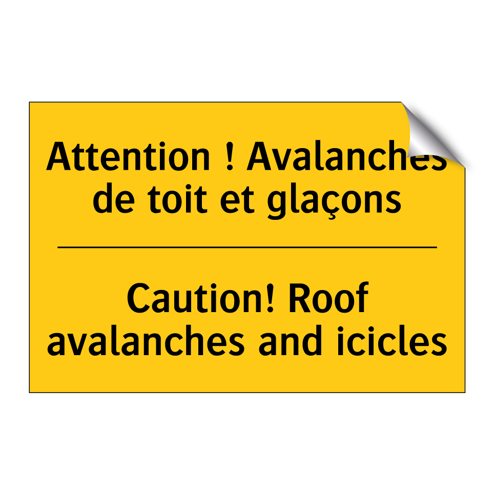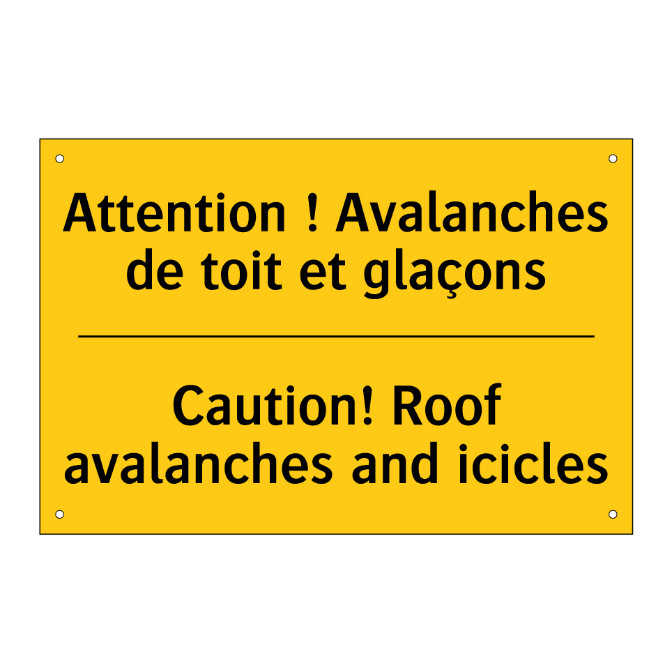 Panneau d'avertissement bilingue avec texte en français : "Attention ! Avalanches de toit et glaçons", et en anglais : "Caution! Roof avalanches and icicles"