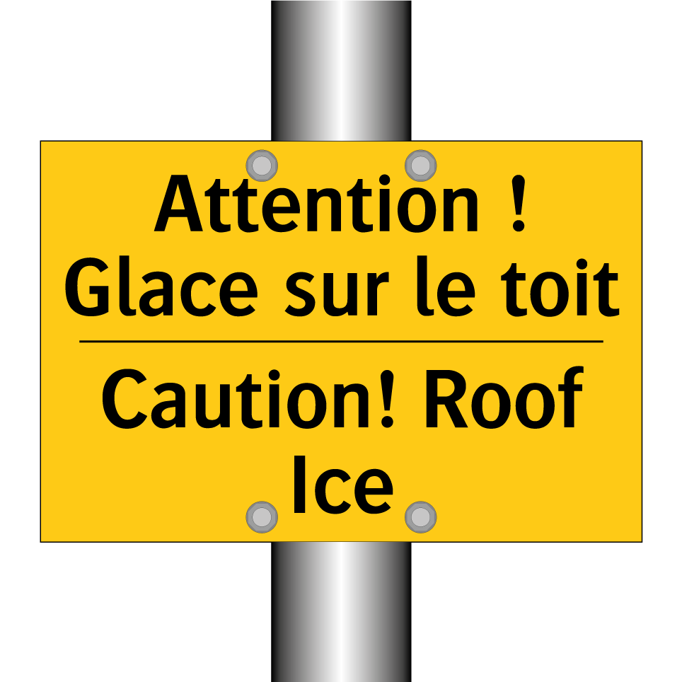 Panneau d'avertissement bilingue avec texte en français : "Attention ! Glace sur le toit", et en anglais : "Caution! Roof Ice"