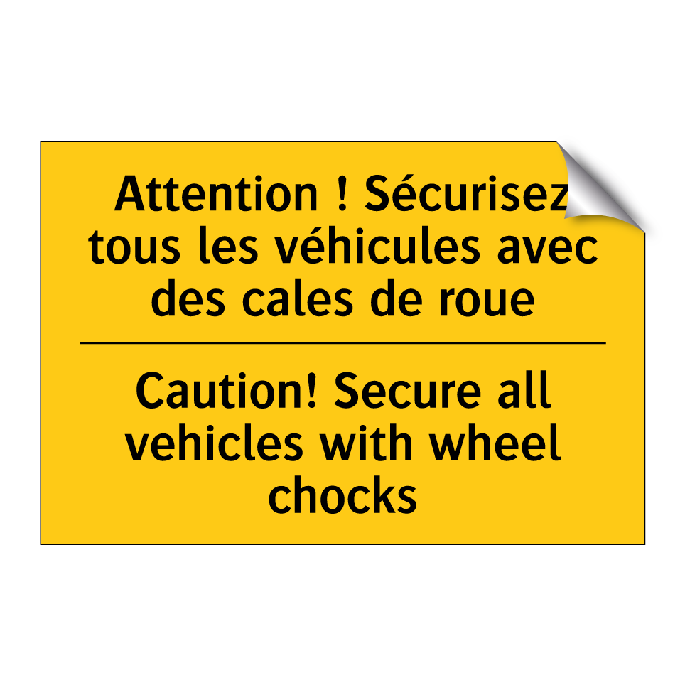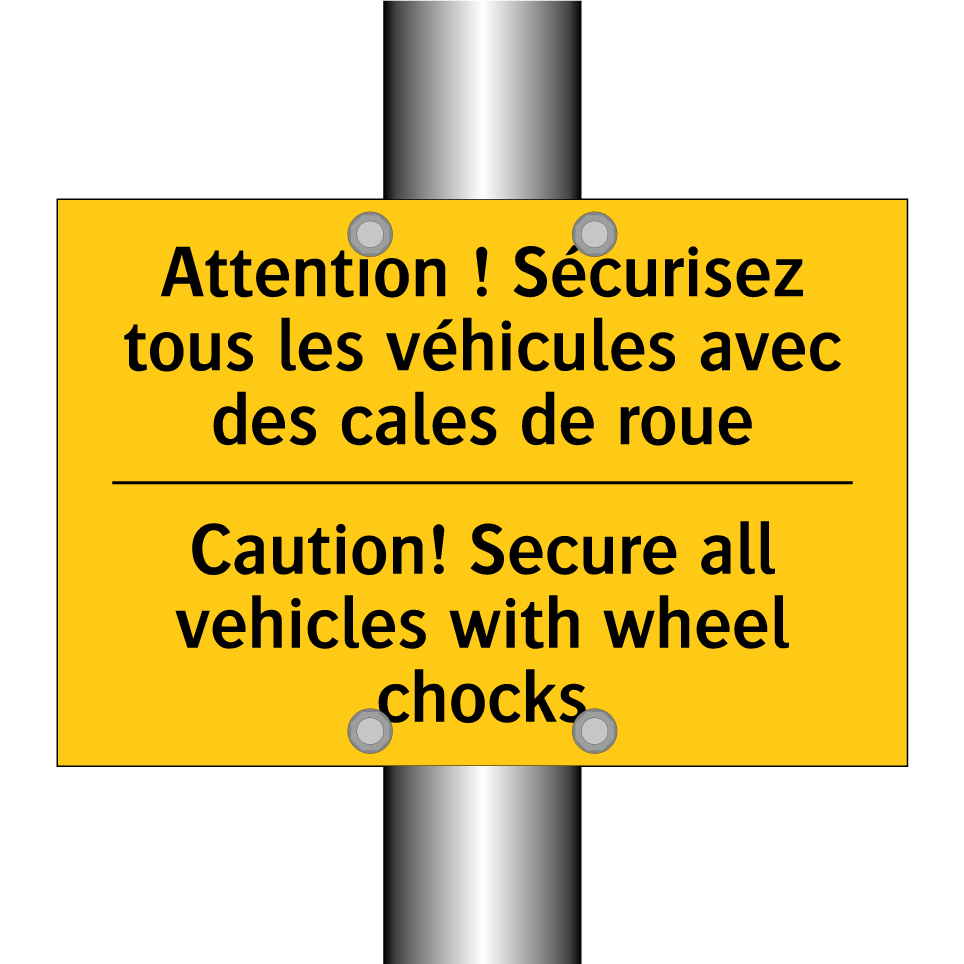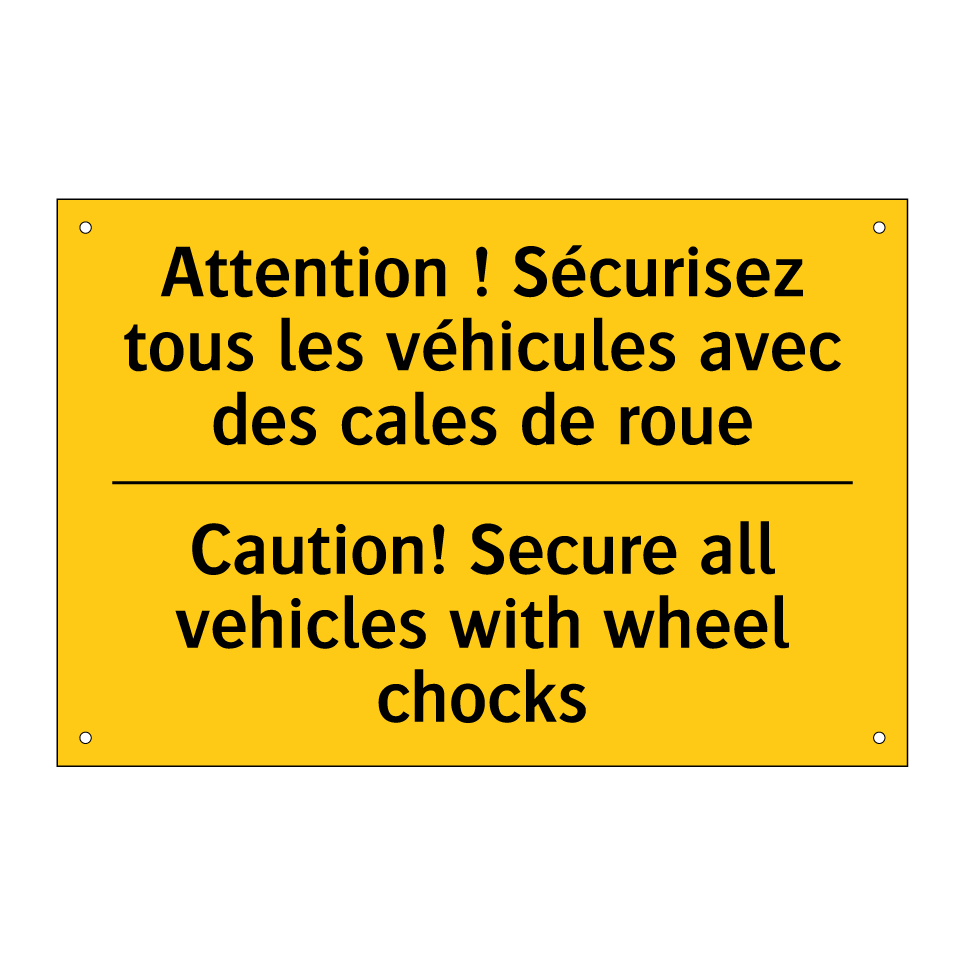 Panneau d'avertissement bilingue avec texte en français : "Attention ! Sécurisez tous les véhicules avec des cales de roue", et en anglais : "Caution! Secure all vehicles with wheel chocks"