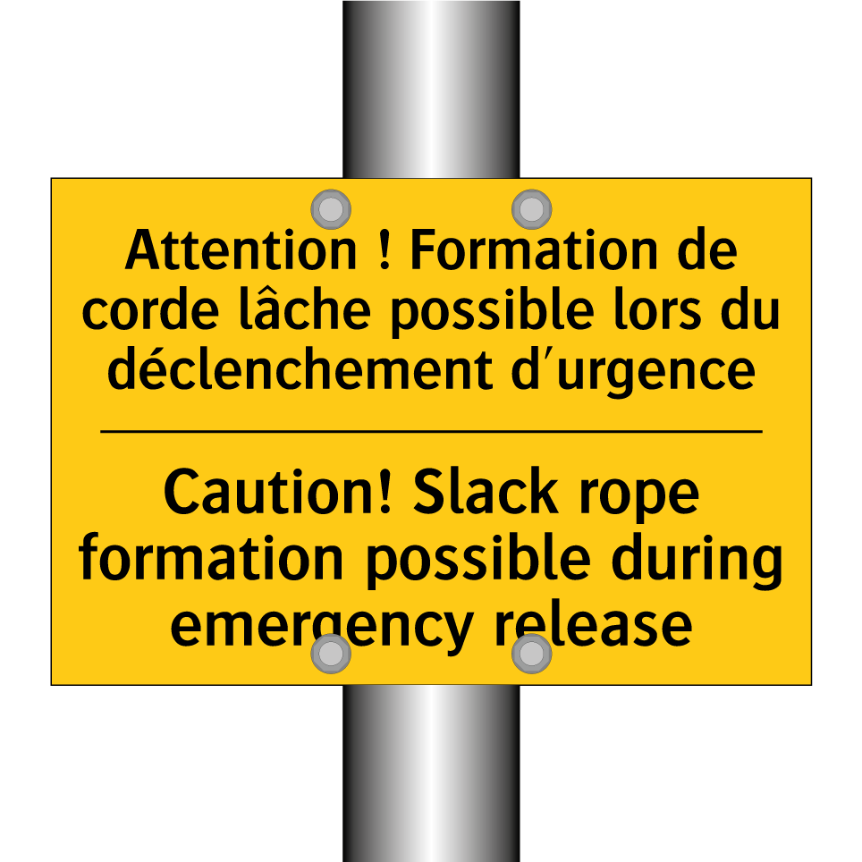Panneau d'avertissement bilingue avec texte en français : "Attention ! Formation de corde lâche possible lors du déclenchement d'urgence", et en anglais : "Caution! Slack rope formation possible during emergency release"