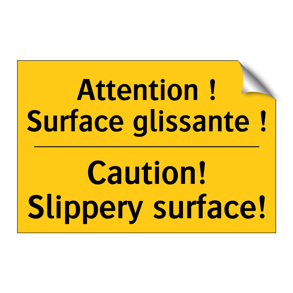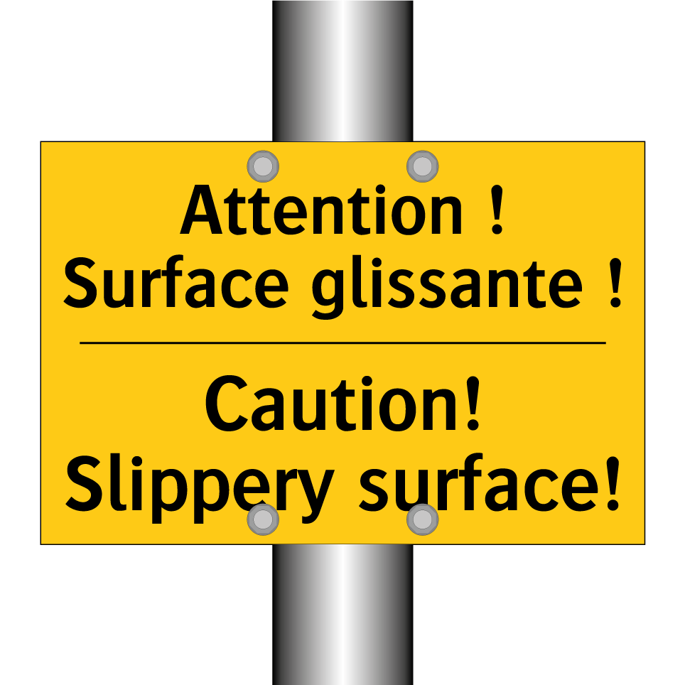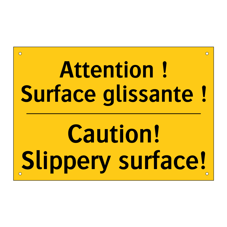 Panneau d'avertissement bilingue avec texte en français : "Attention ! Surface glissante !", et en anglais : "Caution! Slippery surface!"