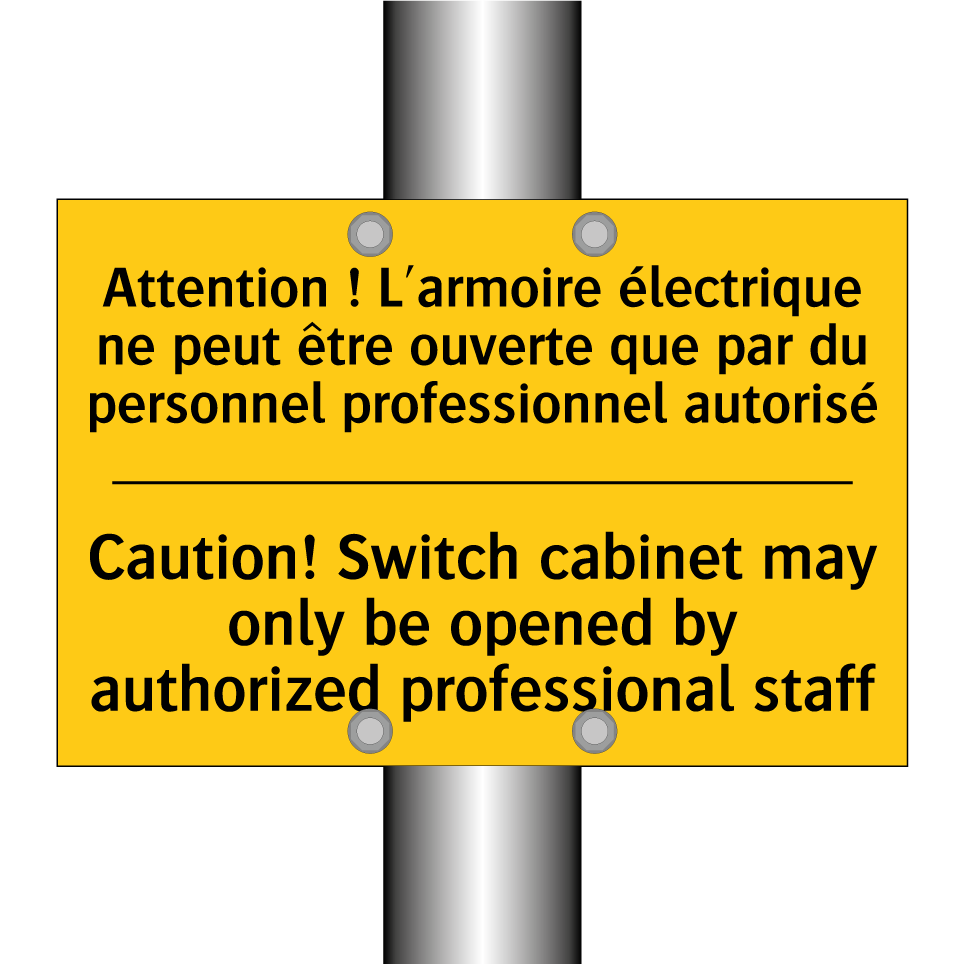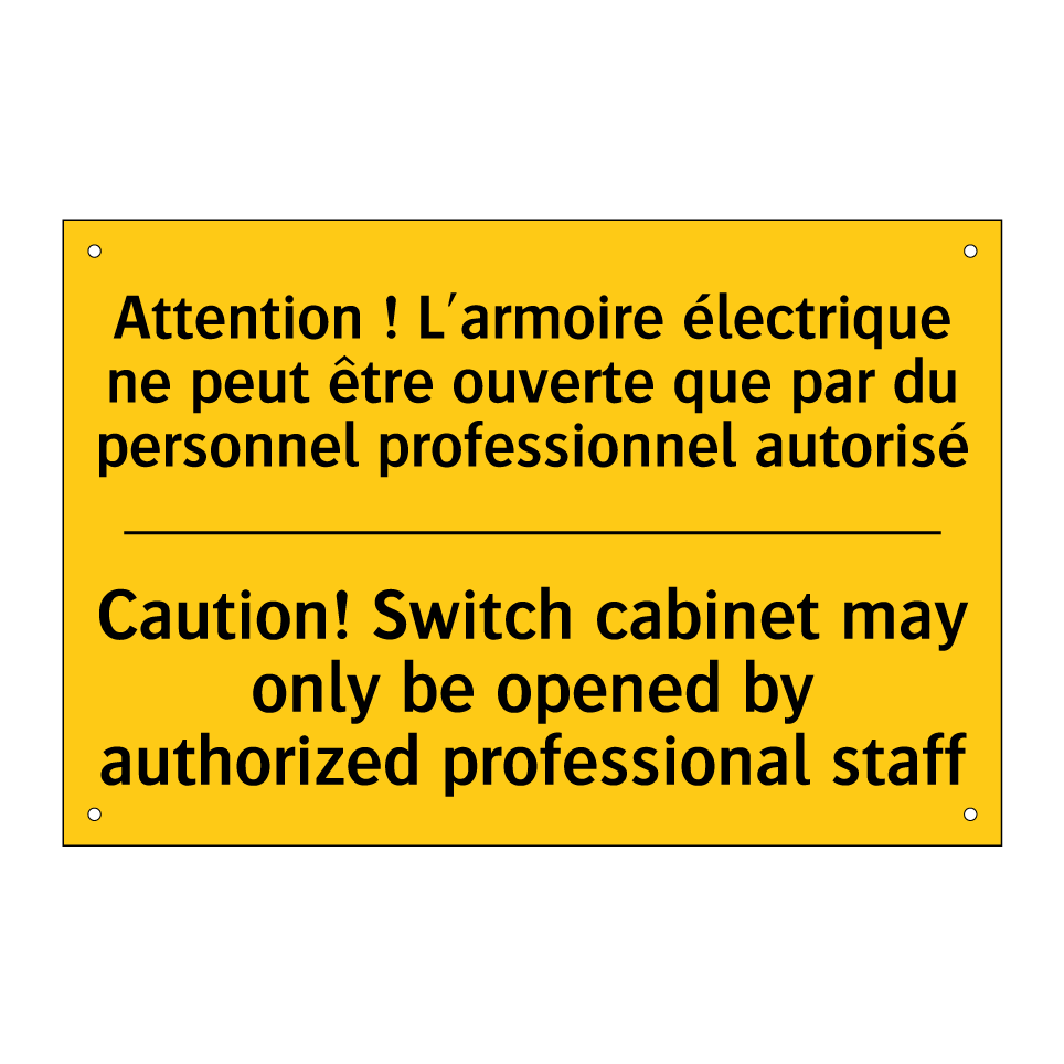 Panneau d'avertissement bilingue avec texte en français : "Attention ! L'armoire électrique ne peut être ouverte que par du personnel professionnel autorisé", et en anglais : "Caution! Switch cabinet may only be opened by authorized professional staff"