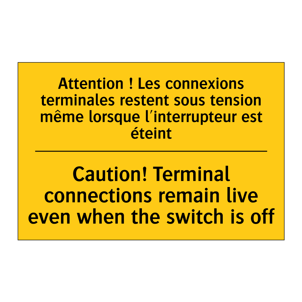 Panneau d'avertissement bilingue avec texte en français : "Attention ! Les connexions terminales restent sous tension même lorsque l'interrupteur est éteint", et en anglais : "Caution! Terminal connections remain live even when the switch is off"
