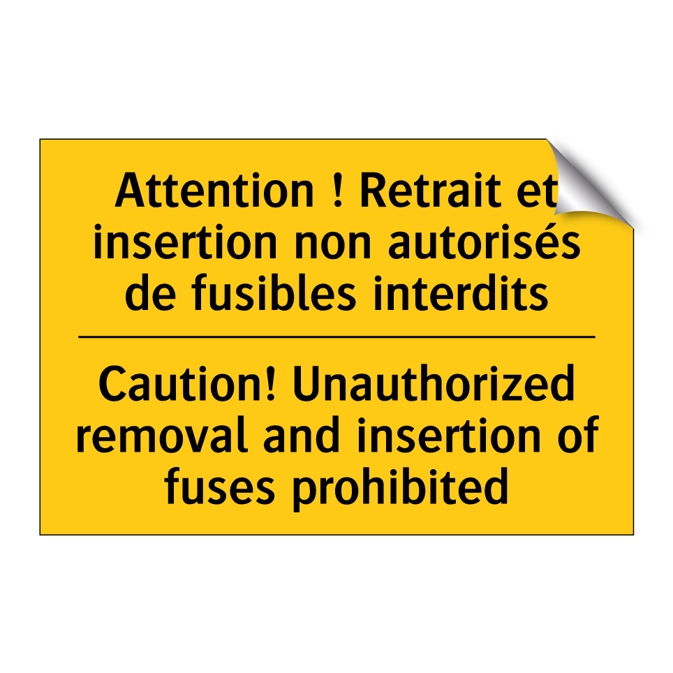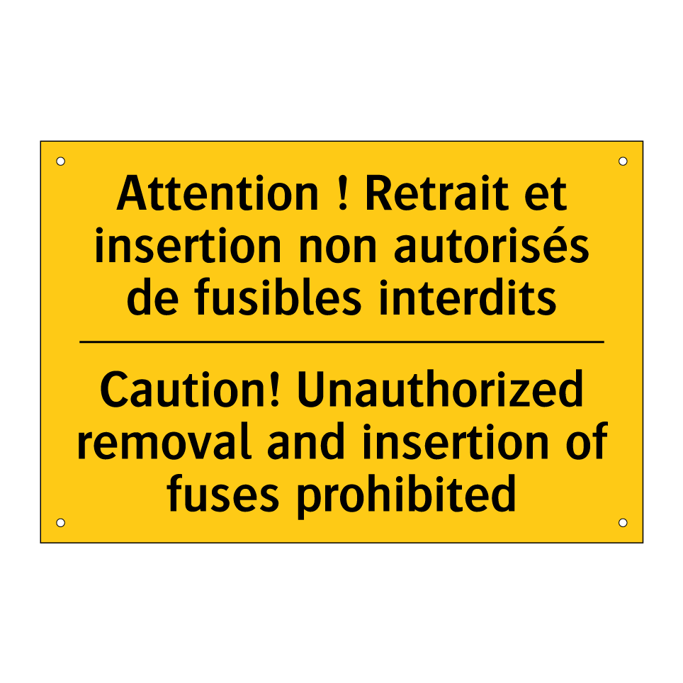 Panneau d'avertissement bilingue avec texte en français : "Attention ! Retrait et insertion non autorisés de fusibles interdits", et en anglais : "Caution! Unauthorized removal and insertion of fuses prohibited"