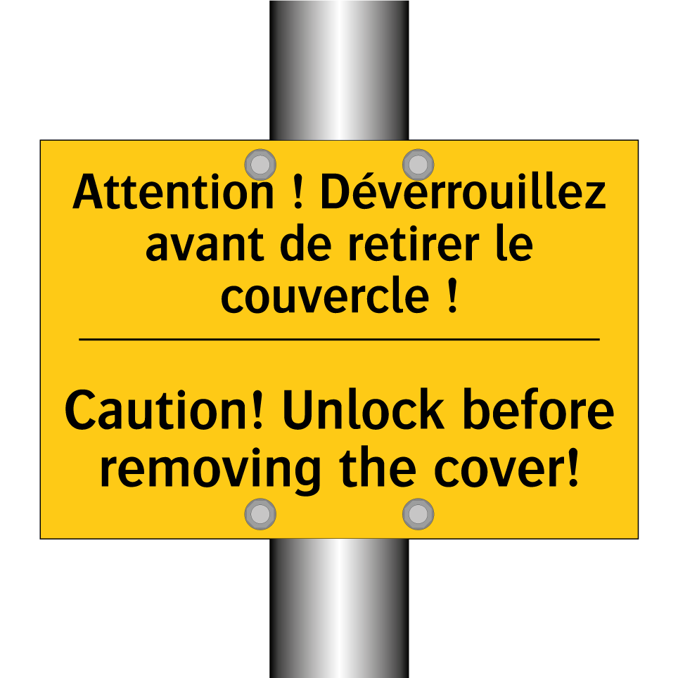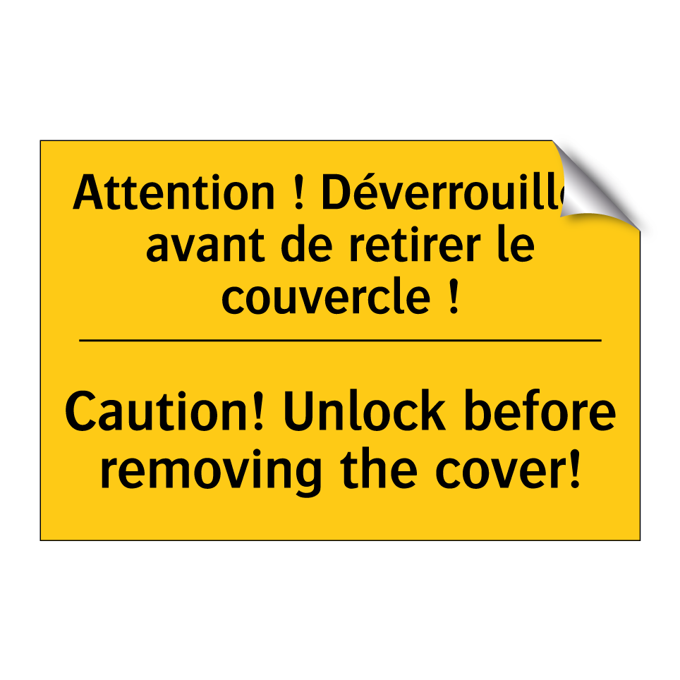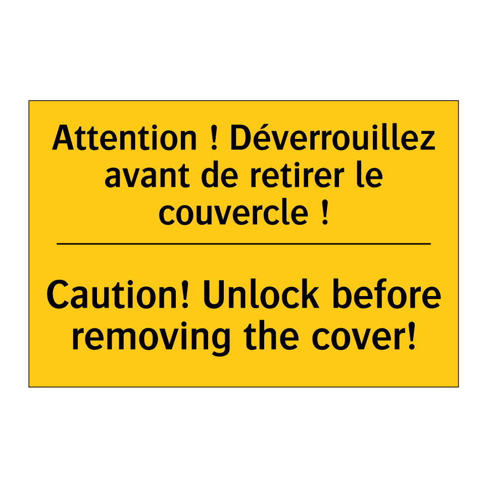 Panneau d'avertissement bilingue avec texte en français : "Attention ! Déverrouillez avant de retirer le couvercle !", et en anglais : "Caution! Unlock before removing the cover!"