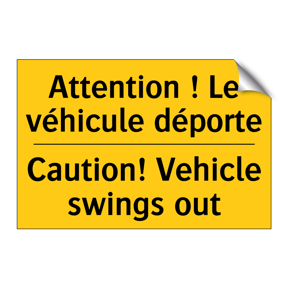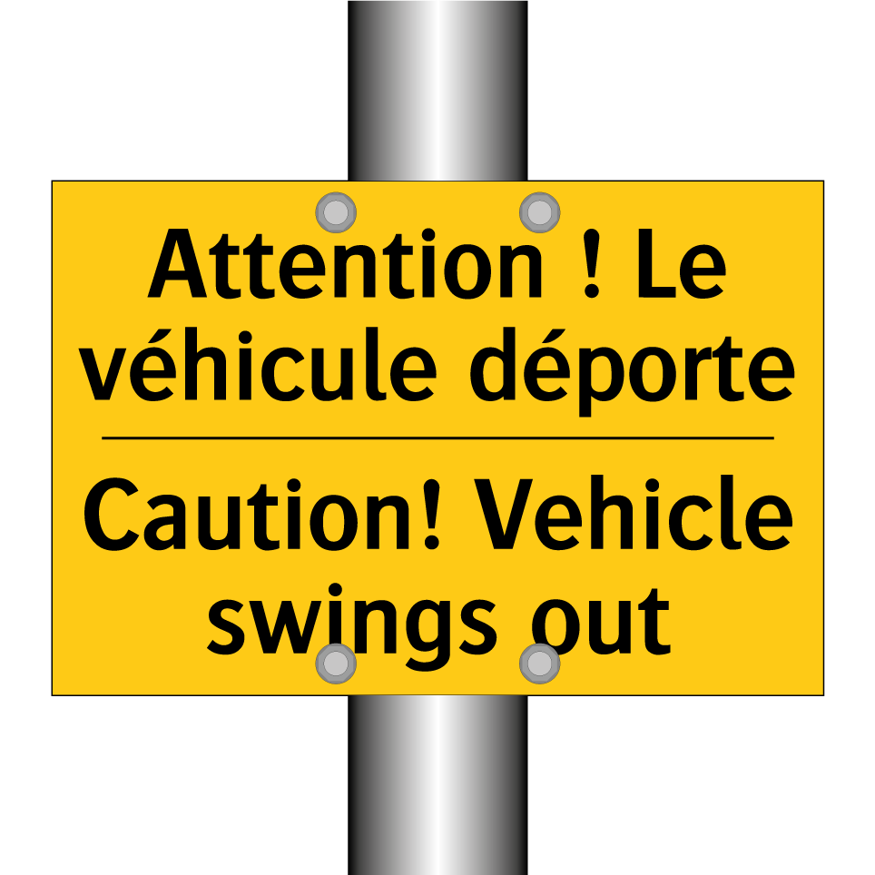 Panneau d'avertissement bilingue avec texte en français : "Attention ! Le véhicule déporte", et en anglais : "Caution! Vehicle swings out"