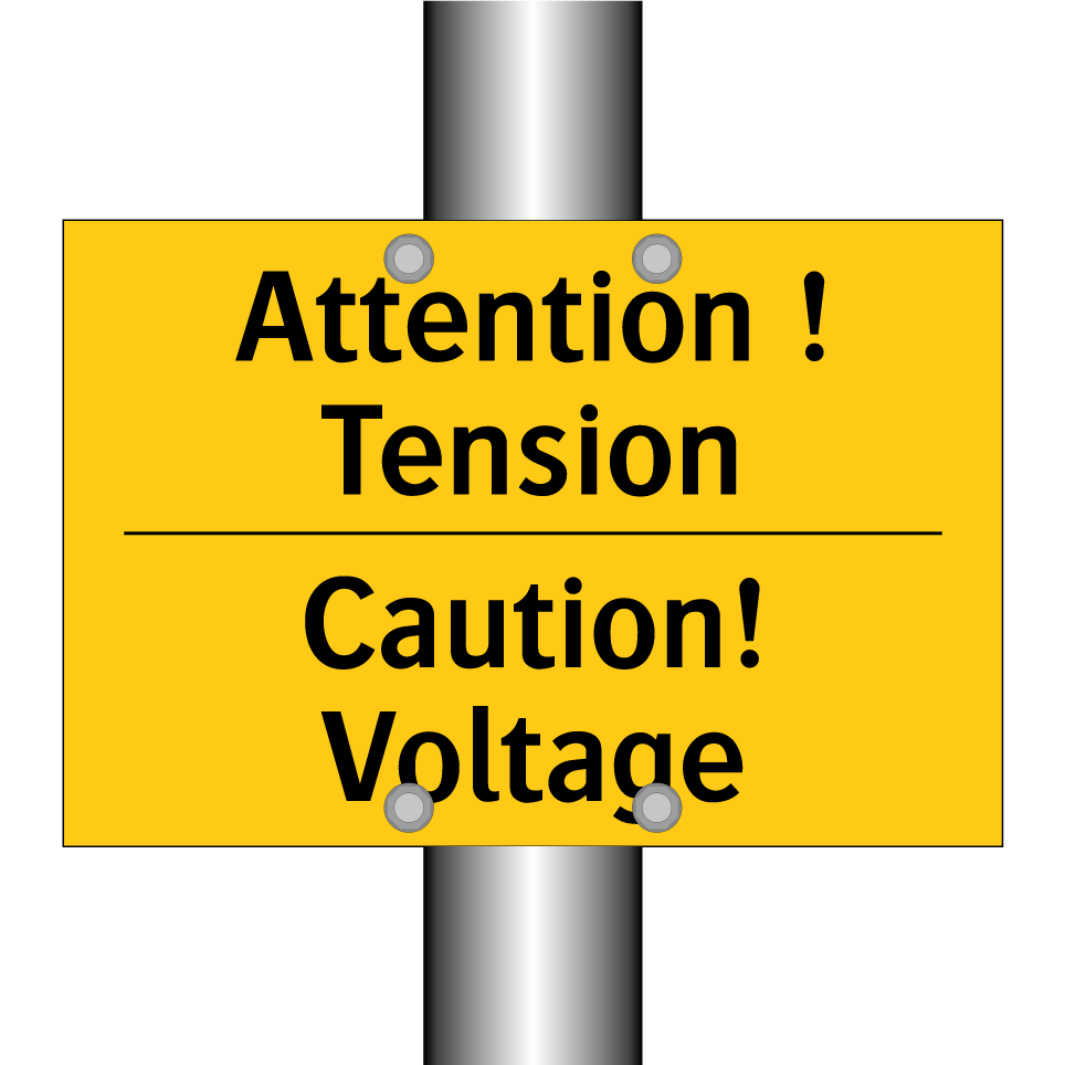Panneau d'avertissement bilingue avec texte en français : "Attention ! Tension", et en anglais : "Caution! Voltage"