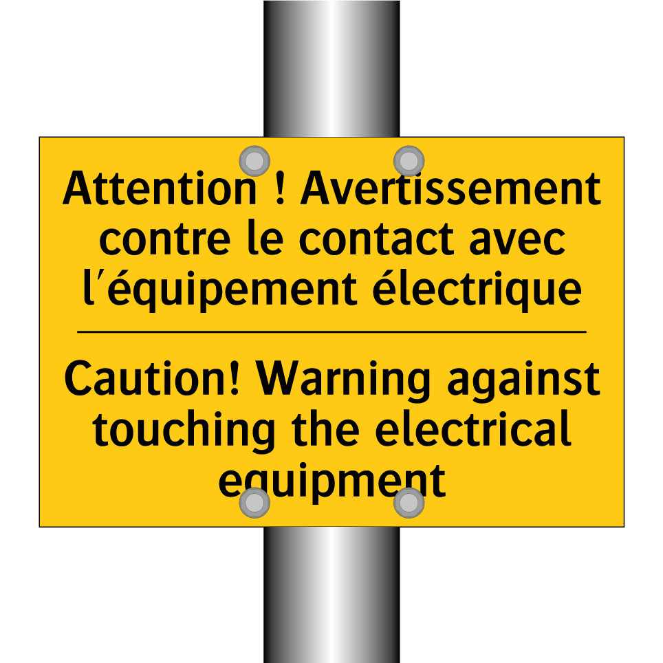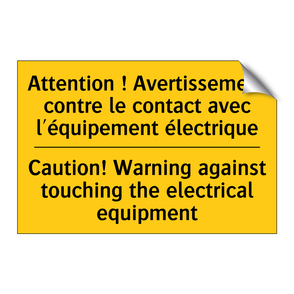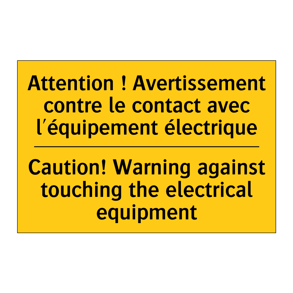 Panneau d'avertissement bilingue avec texte en français : "Attention ! Avertissement contre le contact avec l'équipement électrique", et en anglais : "Caution! Warning against touching the electrical equipment"