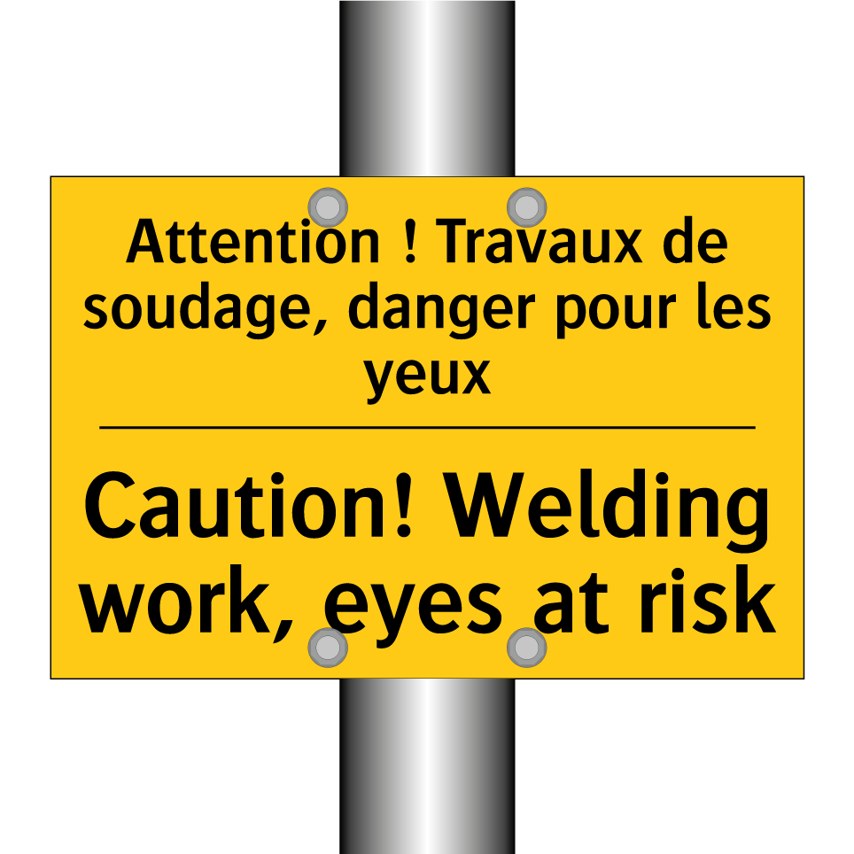Panneau d'avertissement bilingue avec texte en français : "Attention ! Travaux de soudage, danger pour les yeux", et en anglais : "Caution! Welding work, eyes at risk"