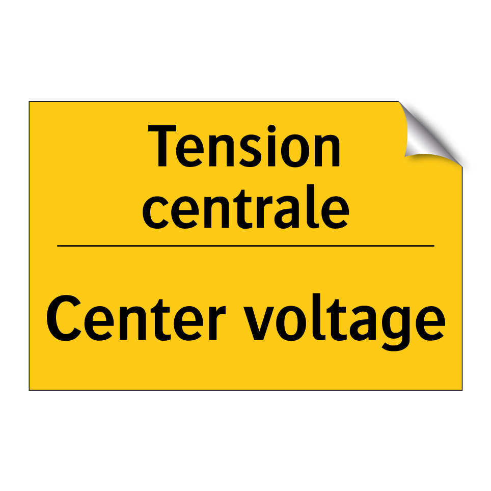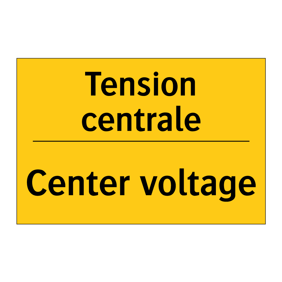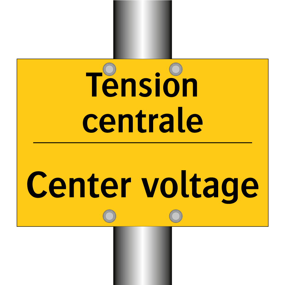 Panneau d'avertissement bilingue avec texte en français : "Tension centrale", et en anglais : "Center voltage"