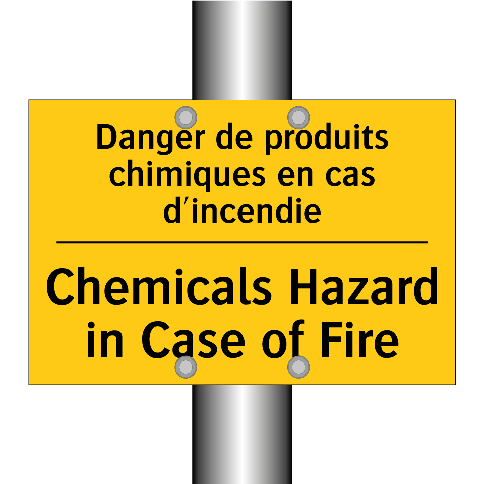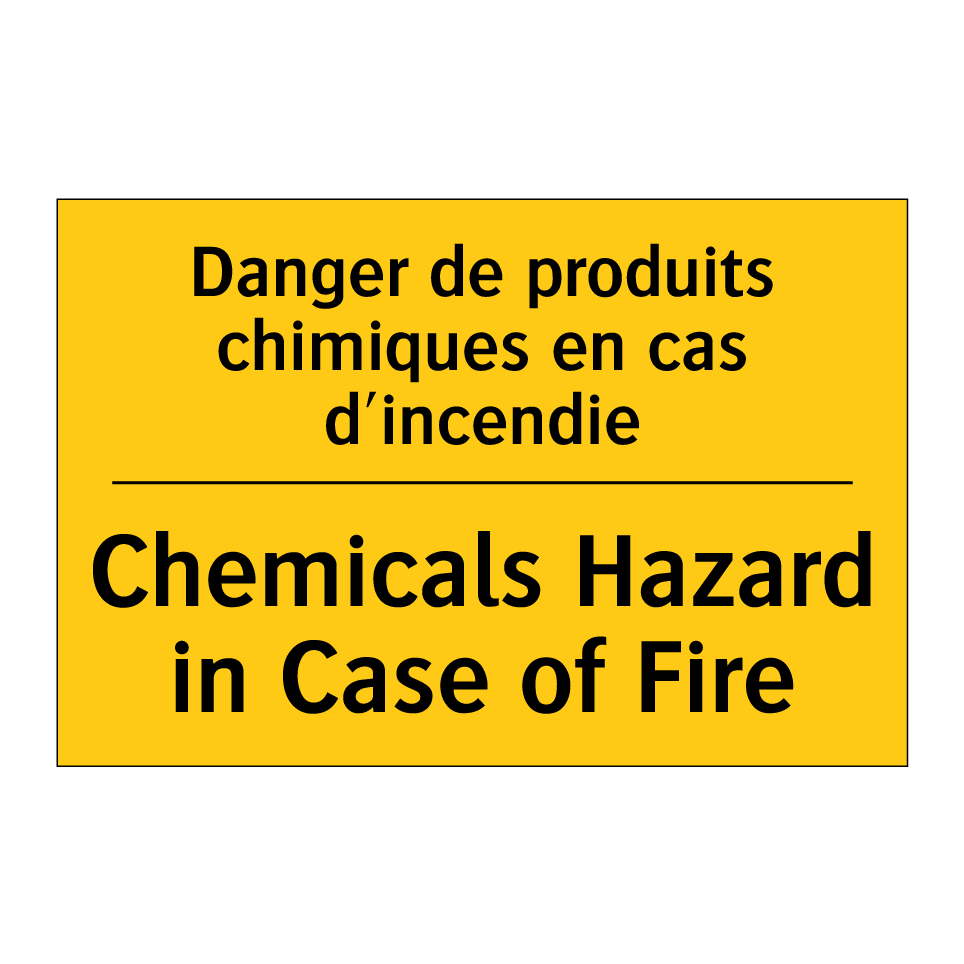 Panneau d'avertissement bilingue avec texte en français : "Danger de produits chimiques en cas d'incendie", et en anglais : "Chemicals Hazard in Case of Fire"
