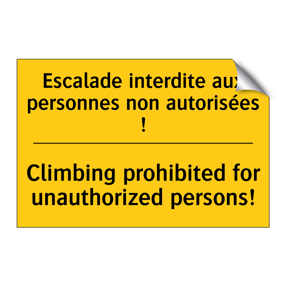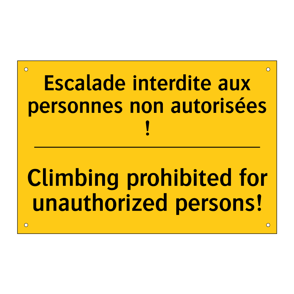 Panneau d'avertissement bilingue avec texte en français : "Escalade interdite aux personnes non autorisées !", et en anglais : "Climbing prohibited for unauthorized persons!"