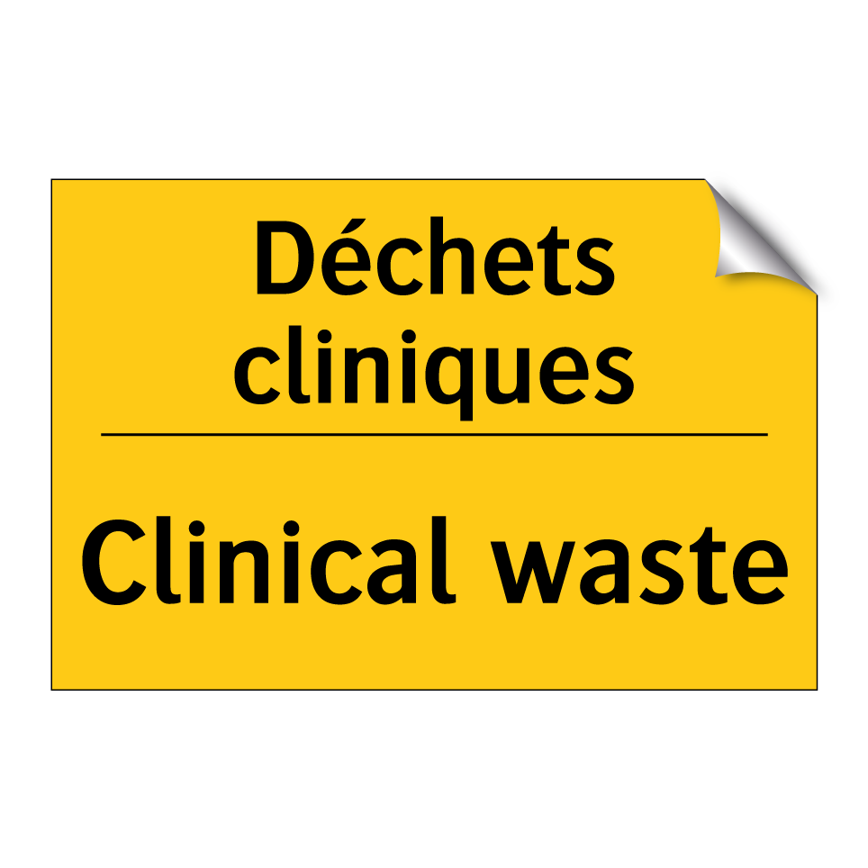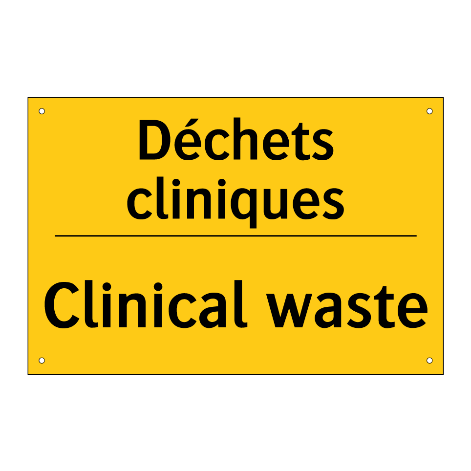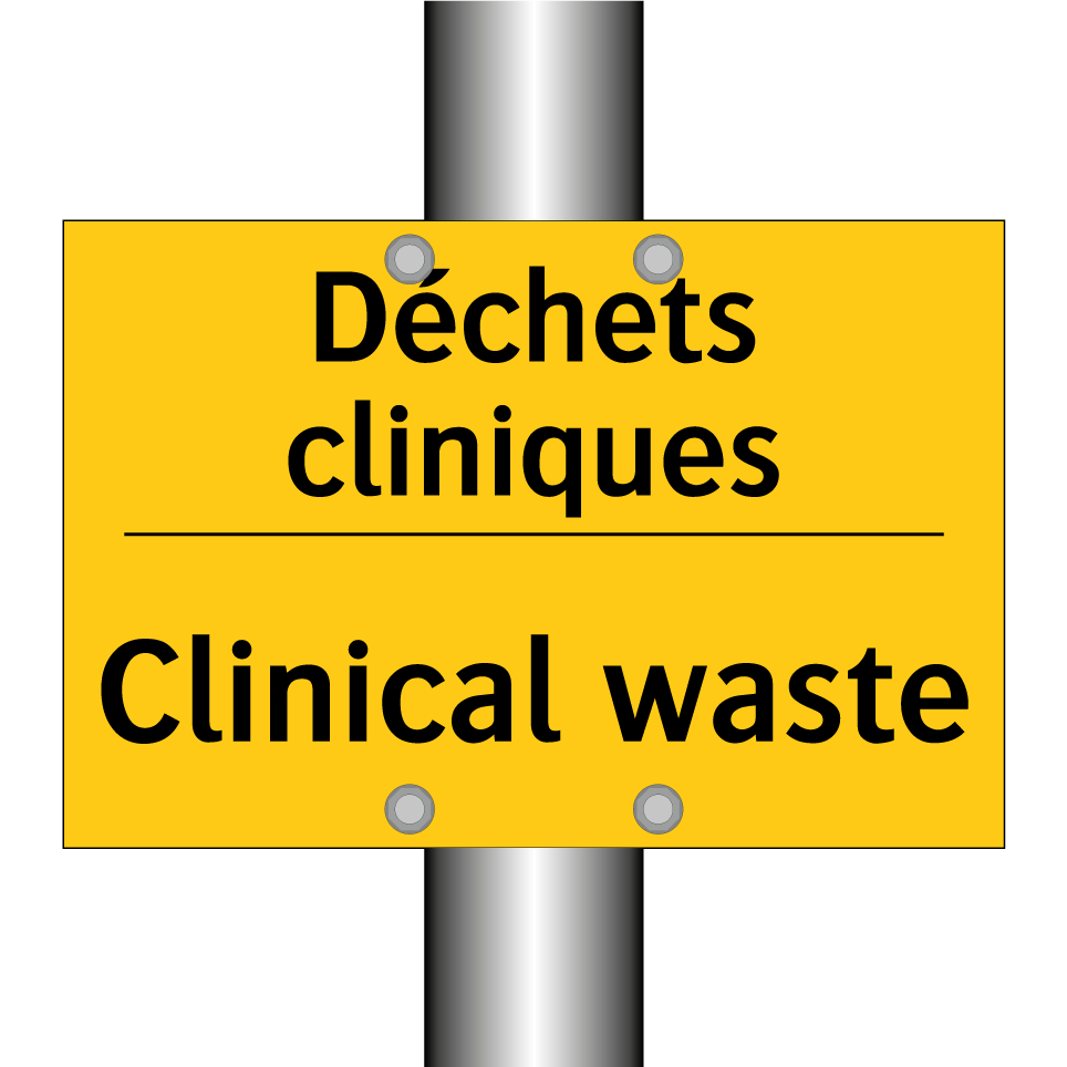 Panneau d'avertissement bilingue avec texte en français : "Déchets cliniques", et en anglais : "Clinical waste"