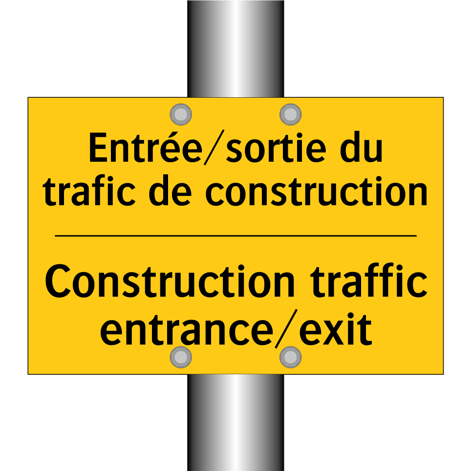 Panneau d'avertissement bilingue avec texte en français : "Entrée/sortie du trafic de construction", et en anglais : "Construction traffic entrance/exit"