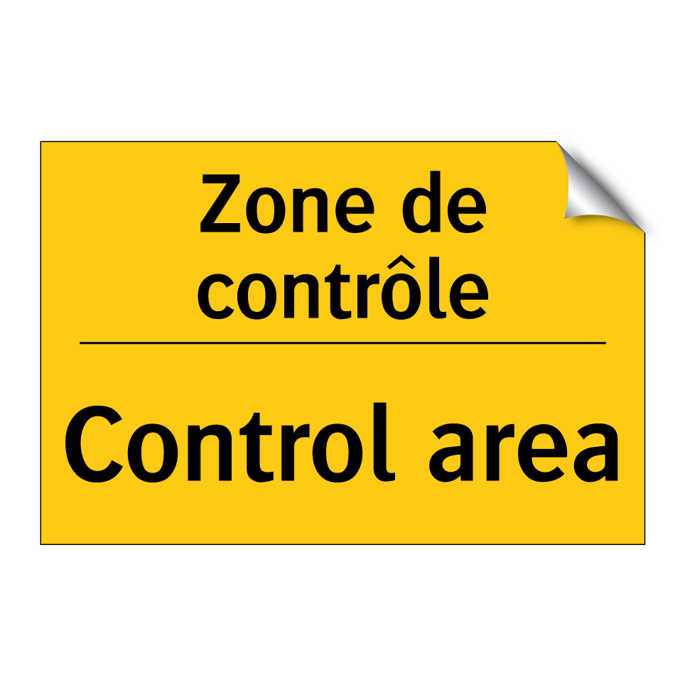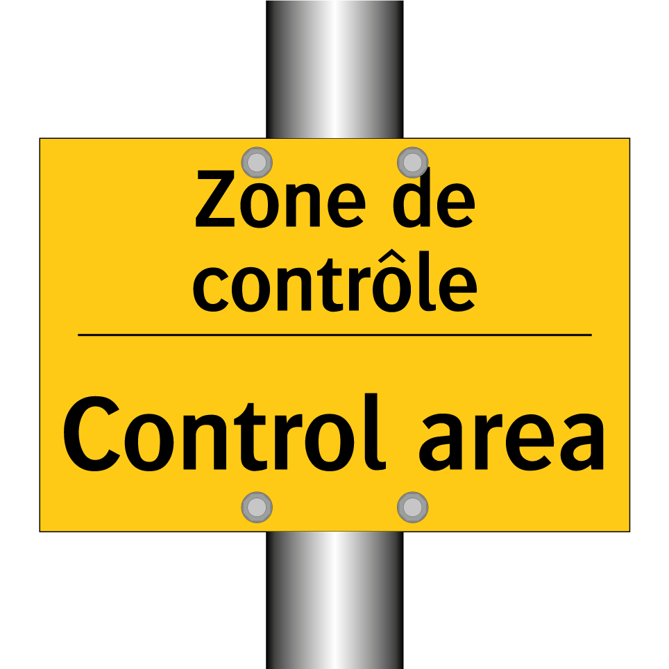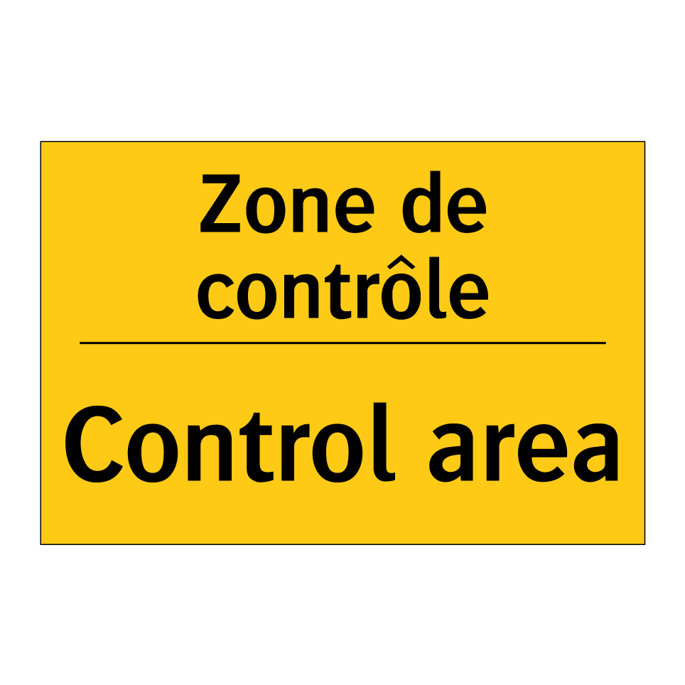 Panneau d'avertissement bilingue avec texte en français : "Zone de contrôle", et en anglais : "Control area"