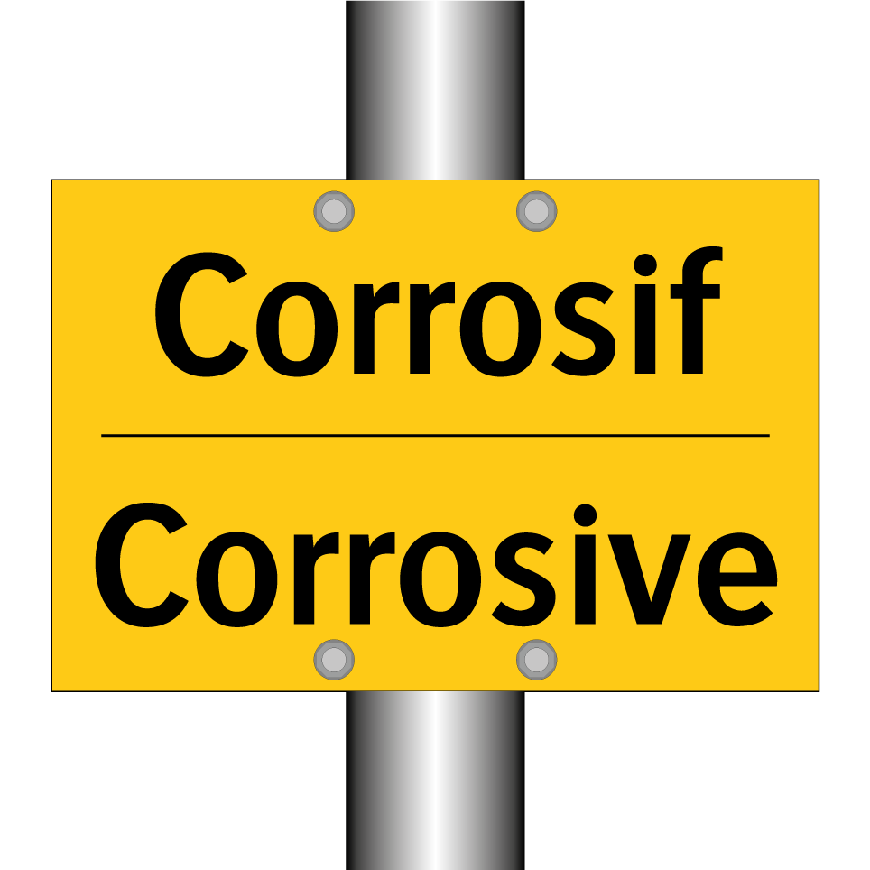 Panneau d'avertissement bilingue avec texte en français : "Corrosif", et en anglais : "Corrosive"