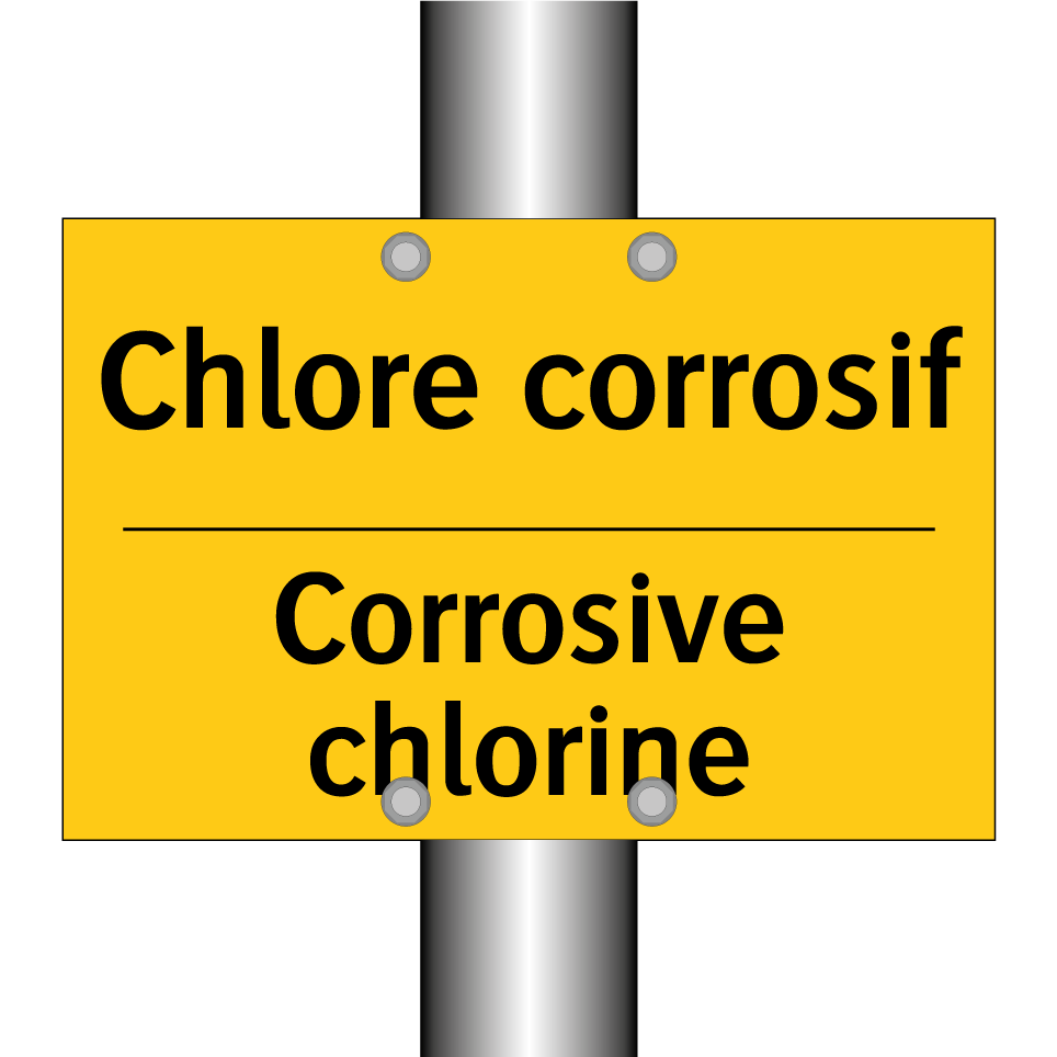 Panneau d'avertissement bilingue avec texte en français : "Chlore corrosif", et en anglais : "Corrosive chlorine"