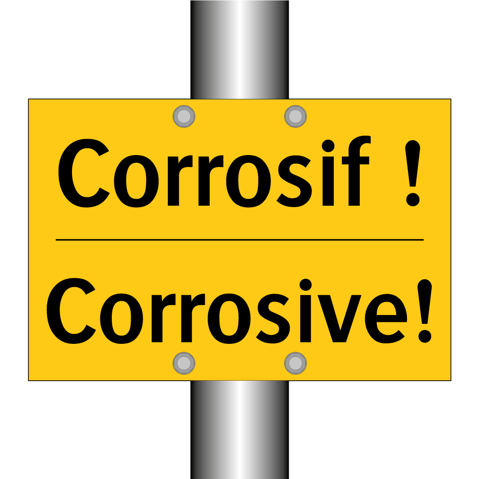 Panneau d'avertissement bilingue avec texte en français : "Corrosif !", et en anglais : "Corrosive!"