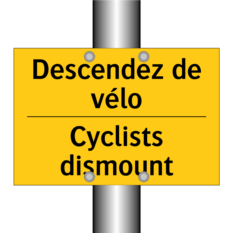 Panneau d'avertissement bilingue avec texte en français : "Descendez de vélo", et en anglais : "Cyclists dismount"