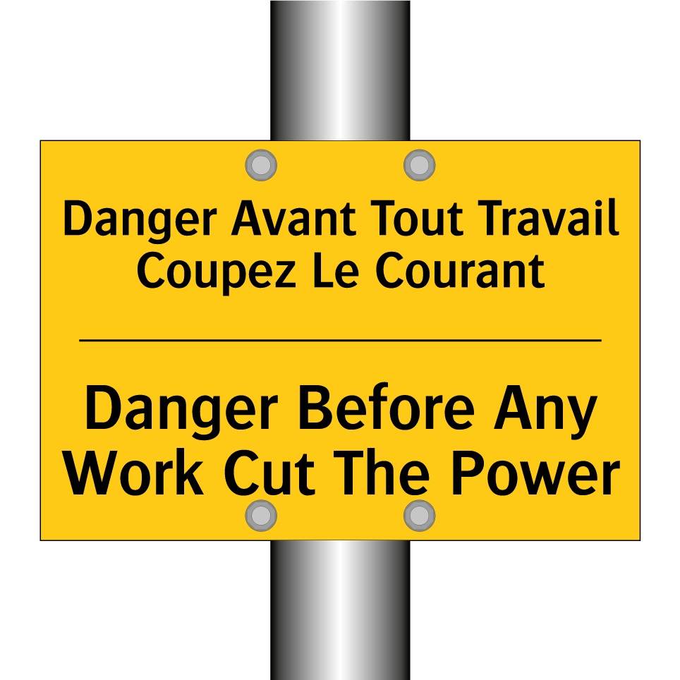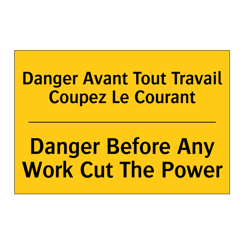 Panneau d'avertissement bilingue avec texte en français : "Danger Avant Tout Travail Coupez Le Courant", et en anglais : "Danger Before Any Work Cut The Power"