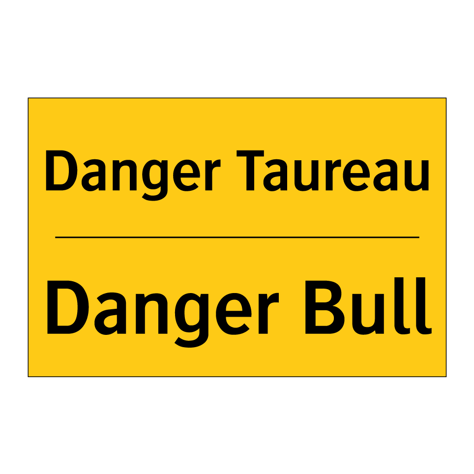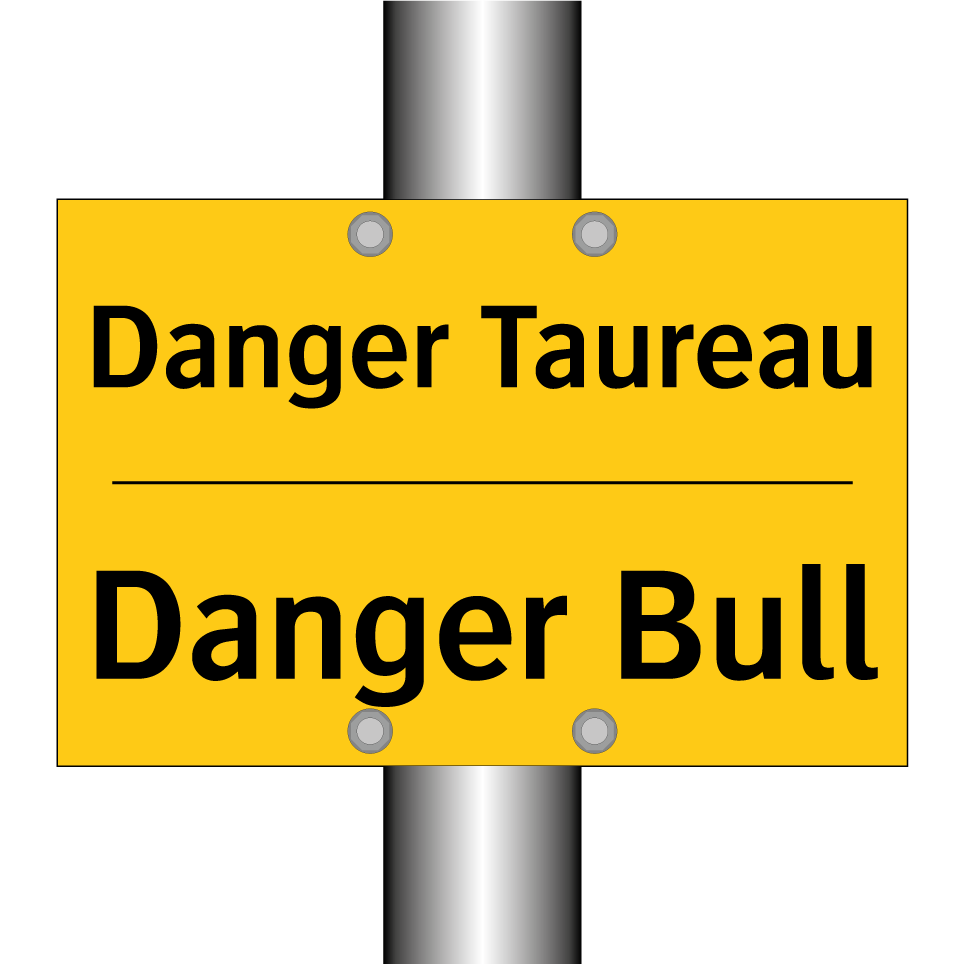Panneau d'avertissement bilingue avec texte en français : "Danger Taureau", et en anglais : "Danger Bull"