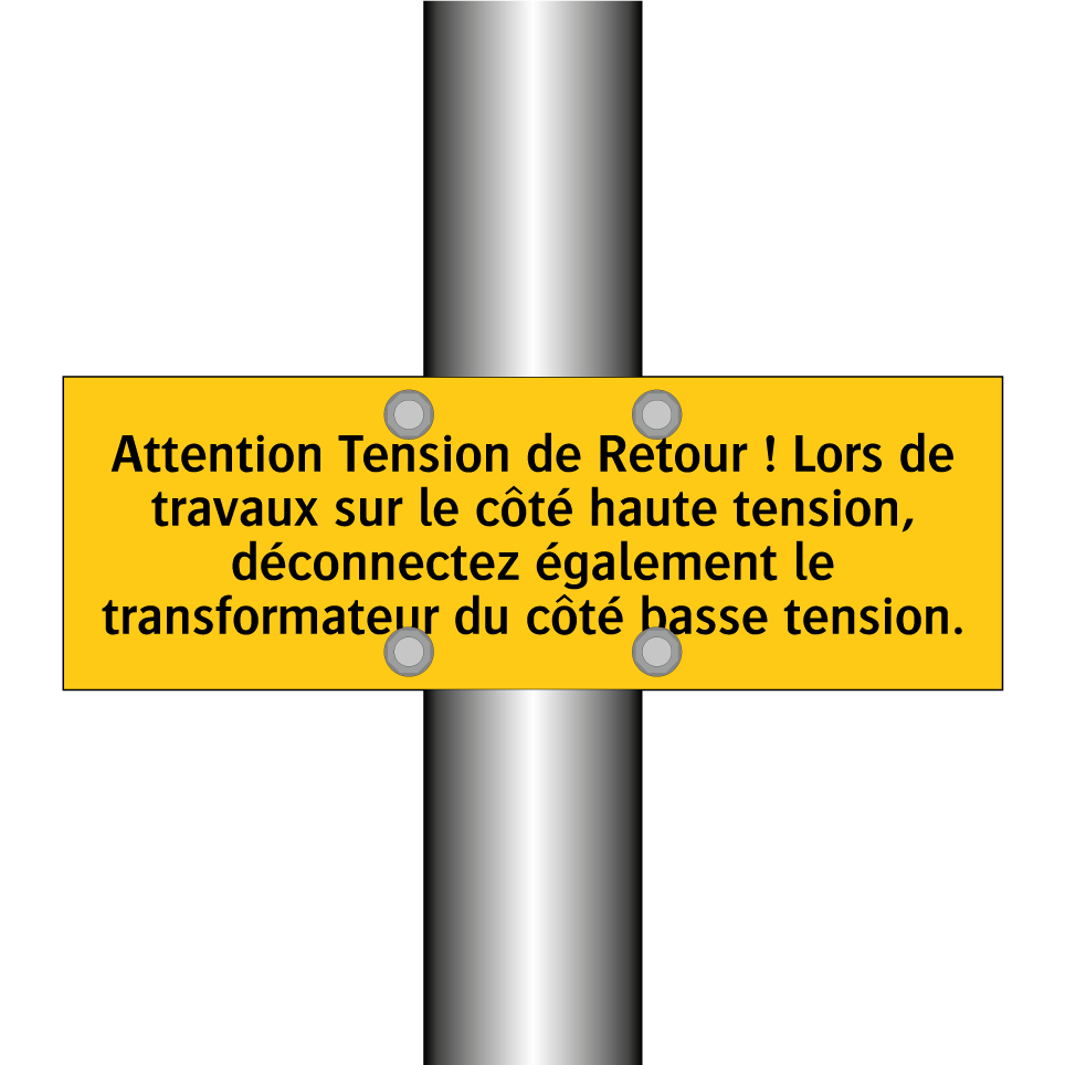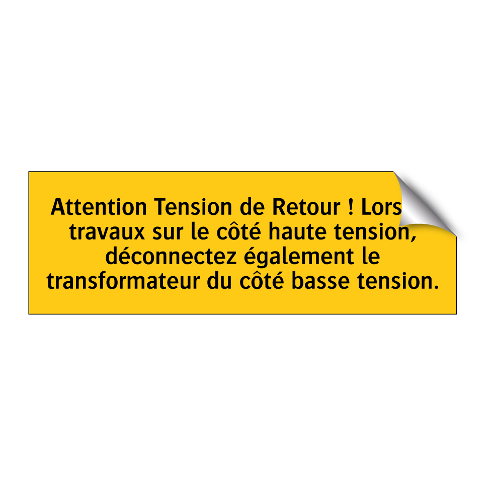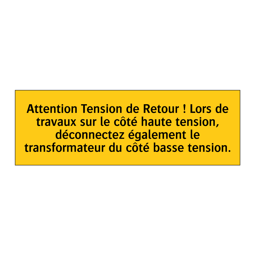 Panneau d'avertissement avec le texte : "Attention Tension de Retour ! Lors de travaux sur le côté haute tension, déconnectez également le transformateur du côté basse tension"