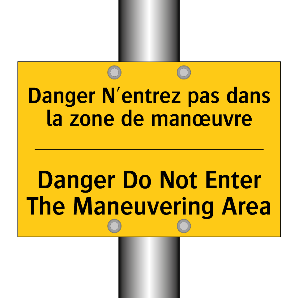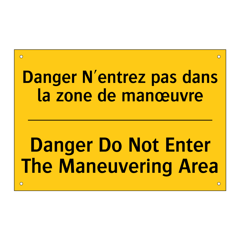 Panneau d'avertissement bilingue avec texte en français : "Danger N'entrez pas dans la zone de manœuvre", et en anglais : "Danger Do Not Enter The Maneuvering Area"