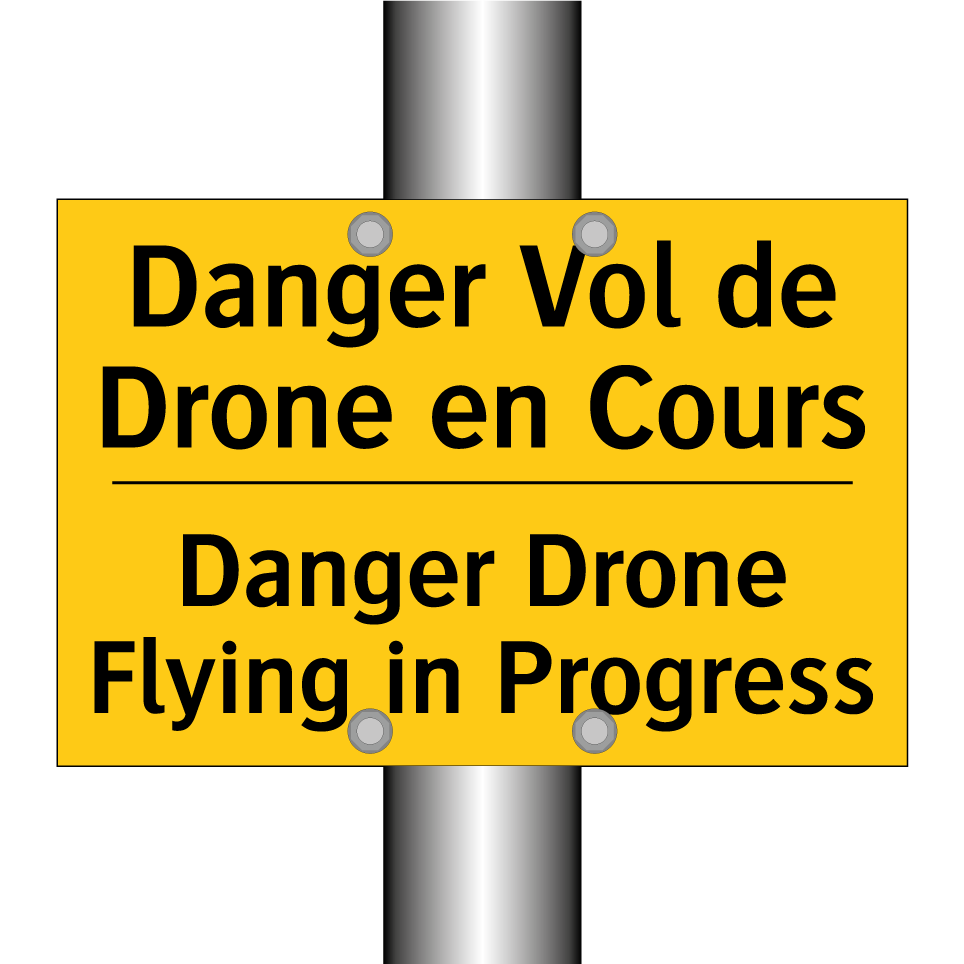 Panneau d'avertissement bilingue avec texte en français : "Danger Vol de Drone en Cours", et en anglais : "Danger Drone Flying in Progress"