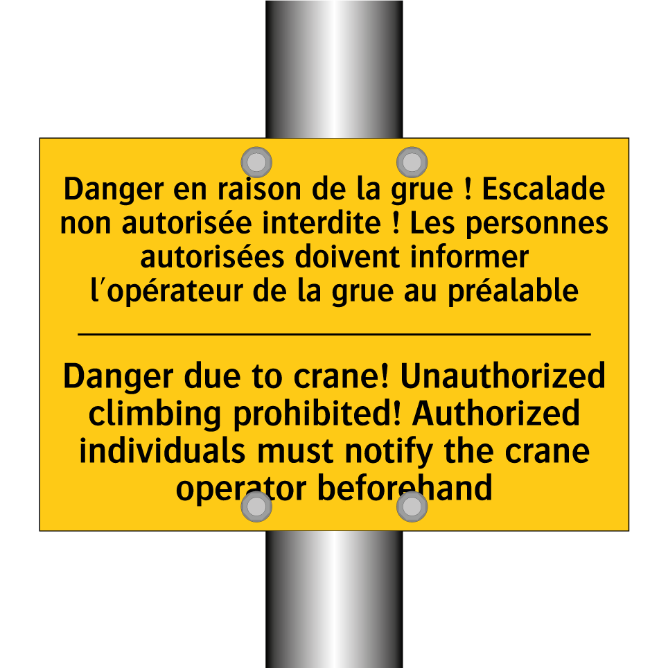 Panneau d'avertissement bilingue avec texte en français : "Danger en raison de la grue ! Escalade non autorisée interdite ! Les personnes autorisées doivent informer l'opérateur de la grue au préalable", et en anglais : "Danger due to crane! Unauthorized climbing prohibited! Authorized individuals must notify the crane operator beforehand"