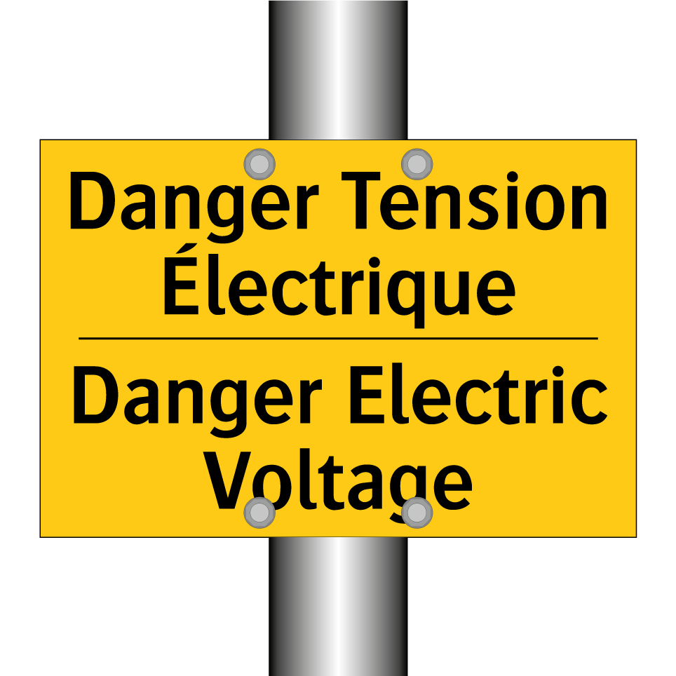 Panneau d'avertissement bilingue avec texte en français : "Danger Tension Électrique", et en anglais : "Danger Electric Voltage"