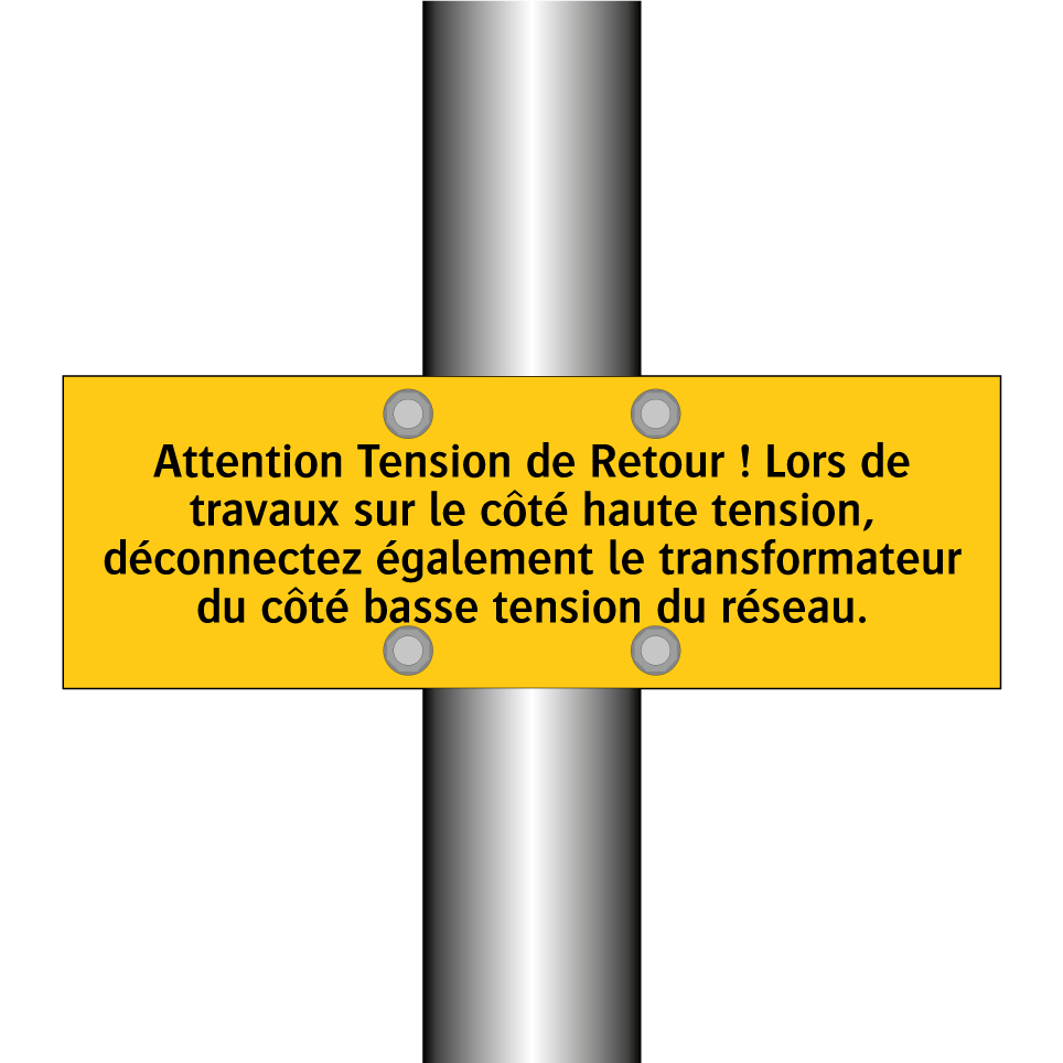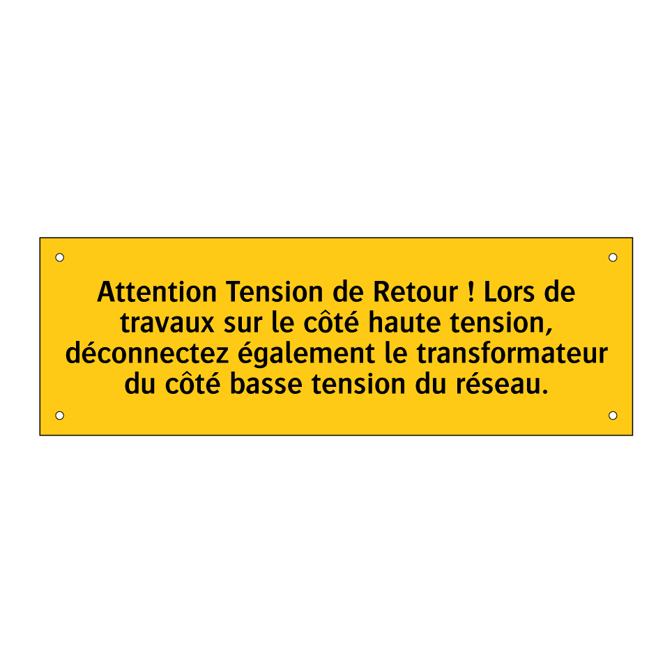 Panneau d'avertissement avec le texte : "Attention Tension de Retour ! Lors de travaux sur le côté haute tension, déconnectez également le transformateur du côté basse tension du réseau"