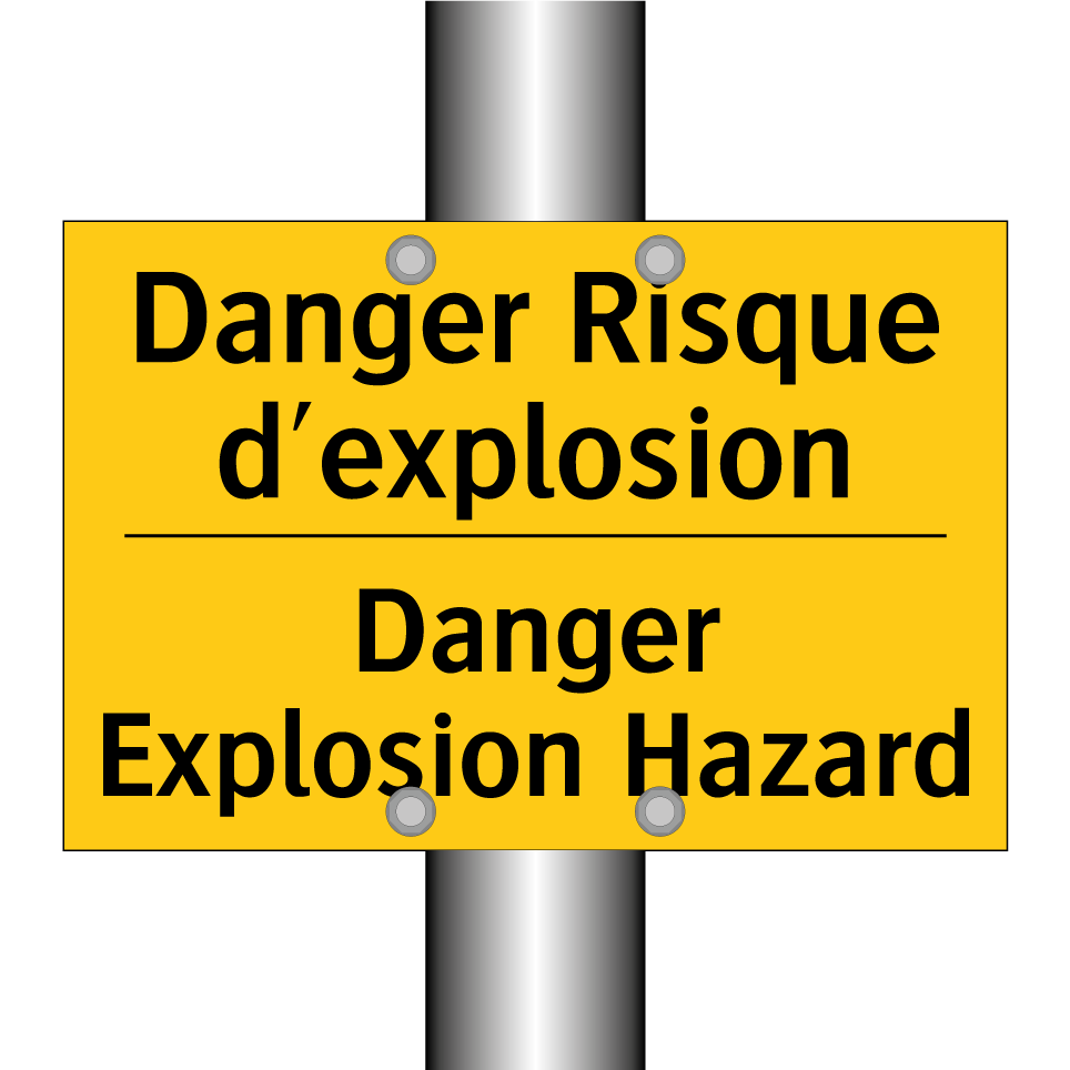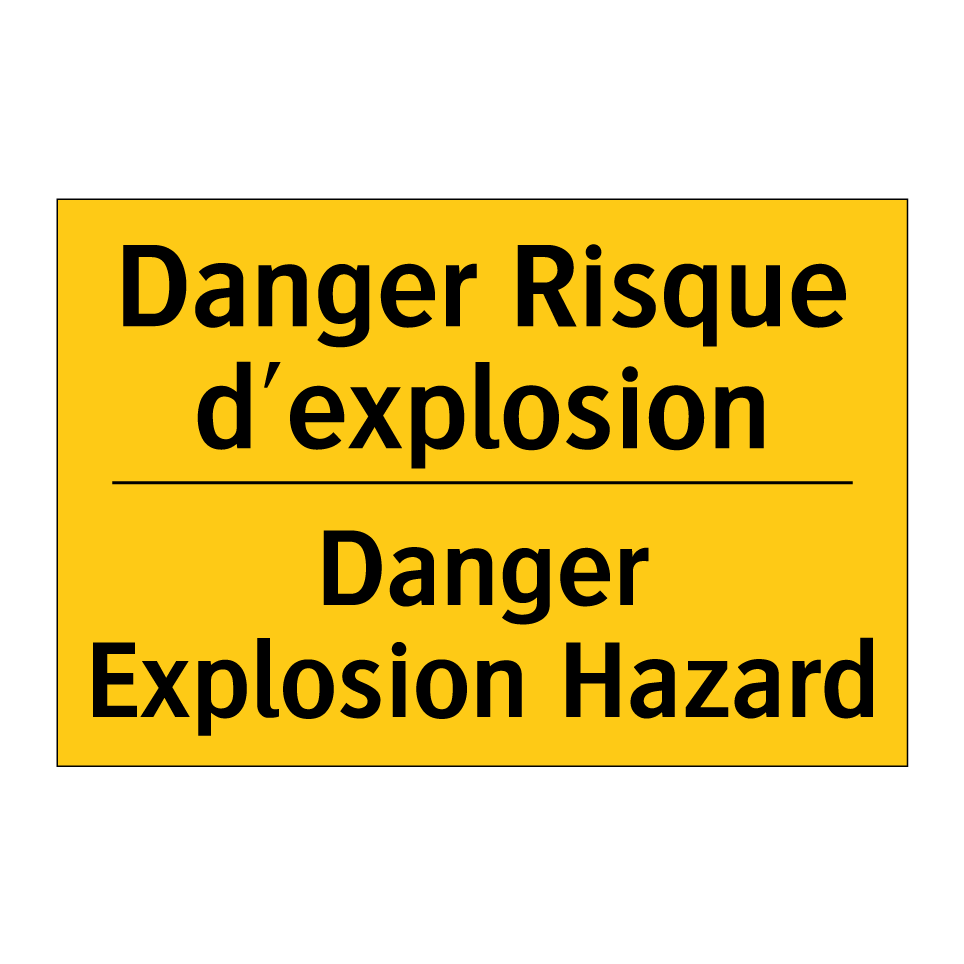 Panneau d'avertissement bilingue avec texte en français : "Danger Risque d'explosion", et en anglais : "Danger Explosion Hazard"