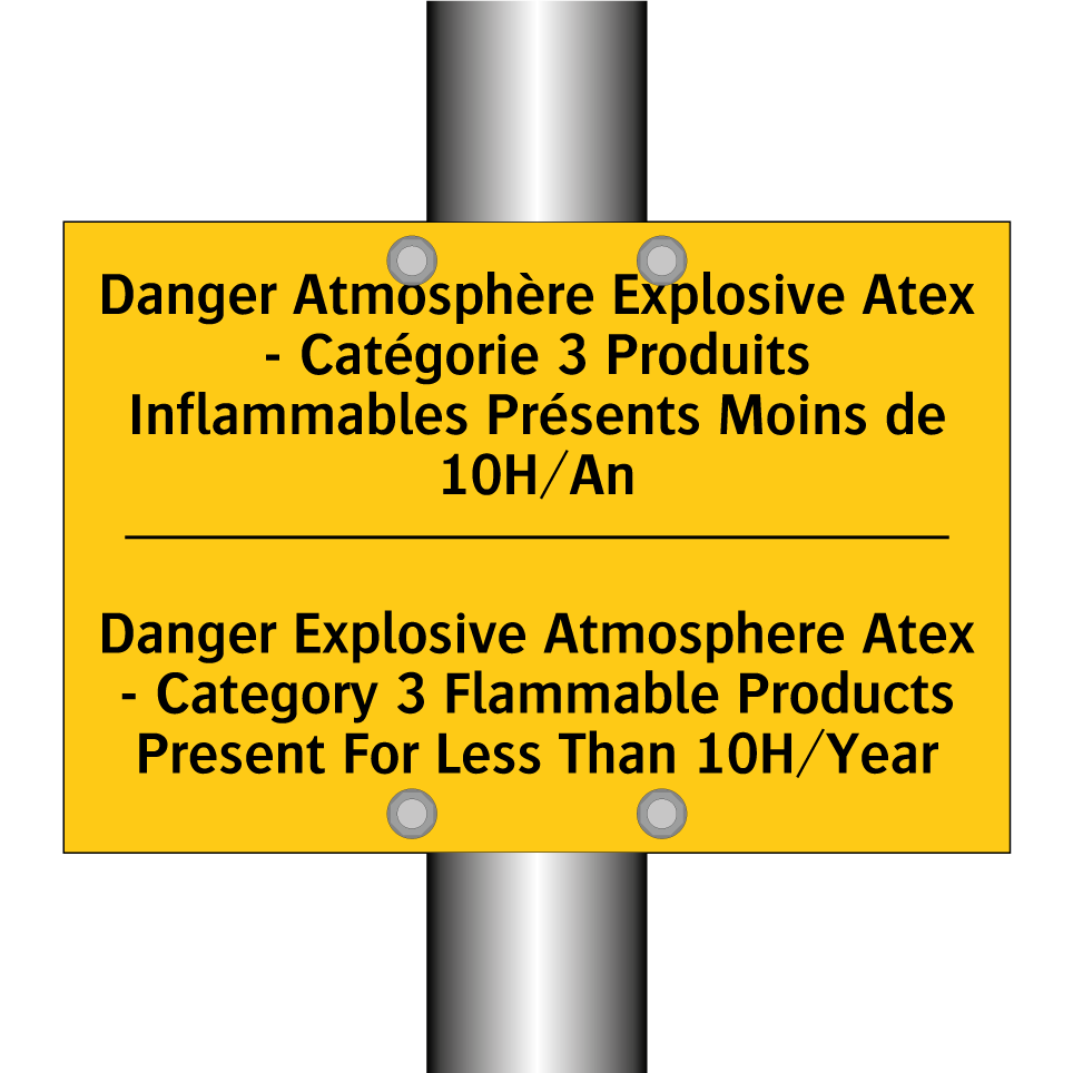 Panneau d'avertissement bilingue avec texte en français : "Danger Atmosphère Explosive Atex - Catégorie 3 Produits Inflammables Présents Moins de 10H/An", et en anglais : "Danger Explosive Atmosphere Atex - Category 3 Flammable Products Present For Less Than 10H/Year"