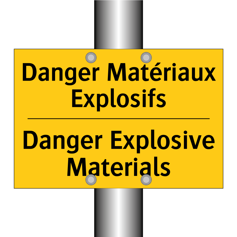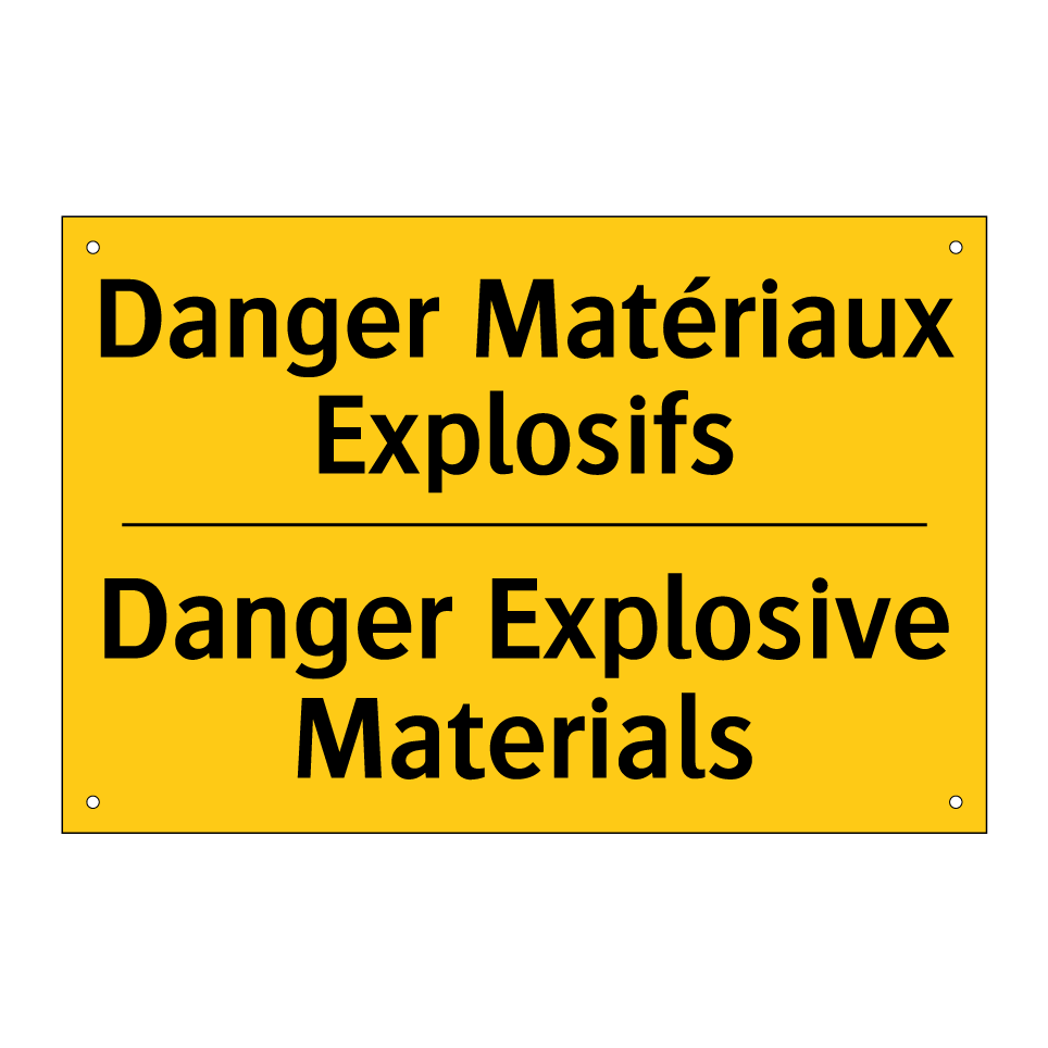 Panneau d'avertissement bilingue avec texte en français : "Danger Matériaux Explosifs", et en anglais : "Danger Explosive Materials"