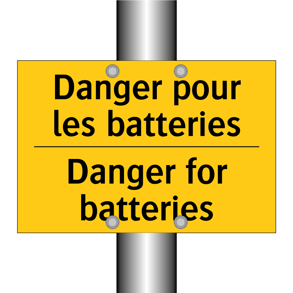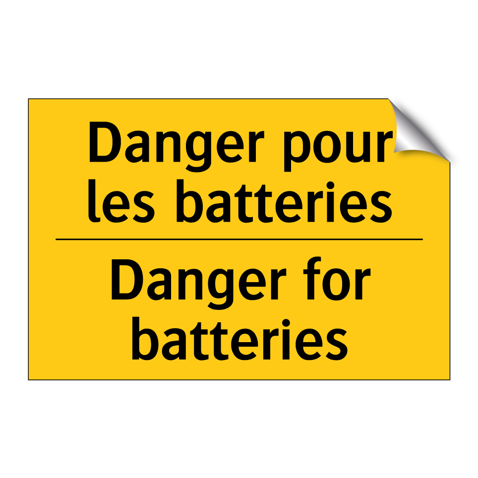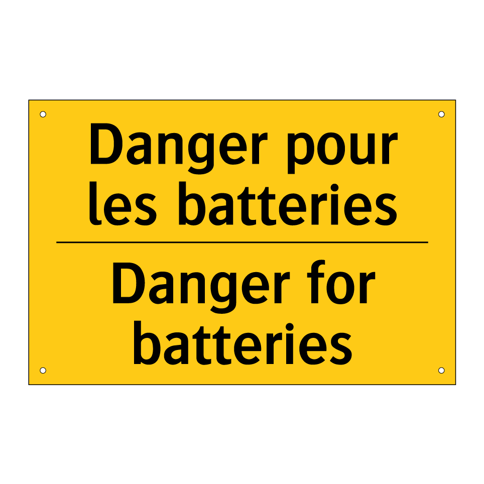Panneau d'avertissement bilingue avec texte en français : "Danger pour les batteries", et en anglais : "Danger for batteries"
