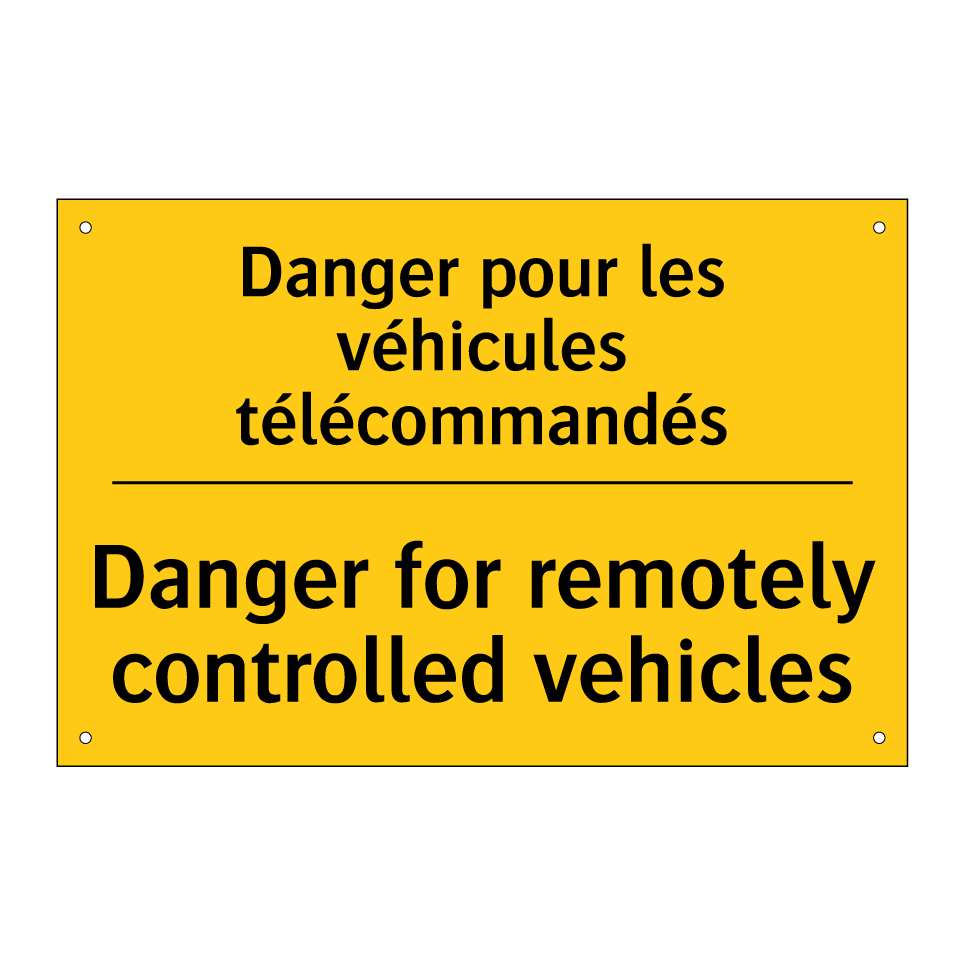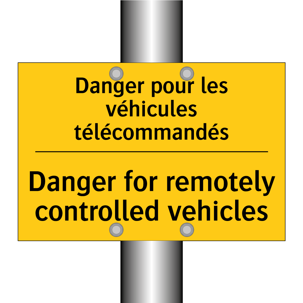 Panneau d'avertissement bilingue avec texte en français : "Danger pour les véhicules télécommandés", et en anglais : "Danger for remotely controlled vehicles"