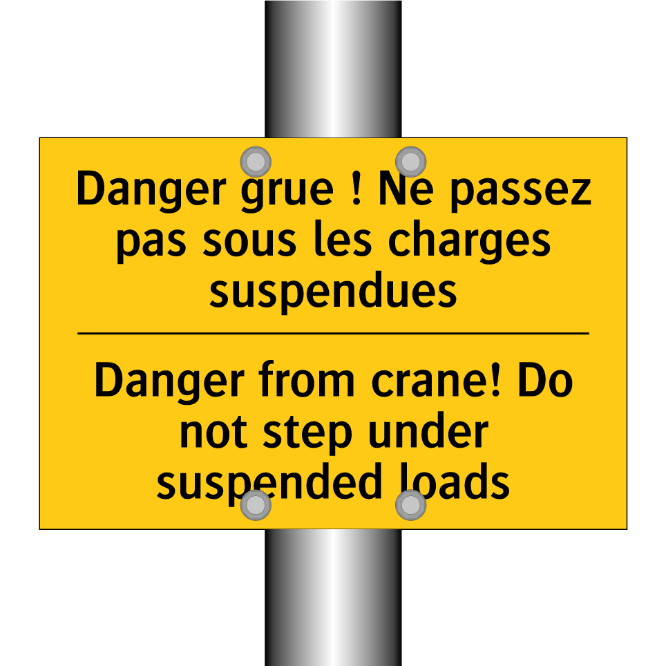 Panneau d'avertissement bilingue avec texte en français : "Danger grue ! Ne passez pas sous les charges suspendues", et en anglais : "Danger from crane! Do not step under suspended loads"