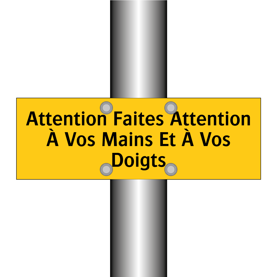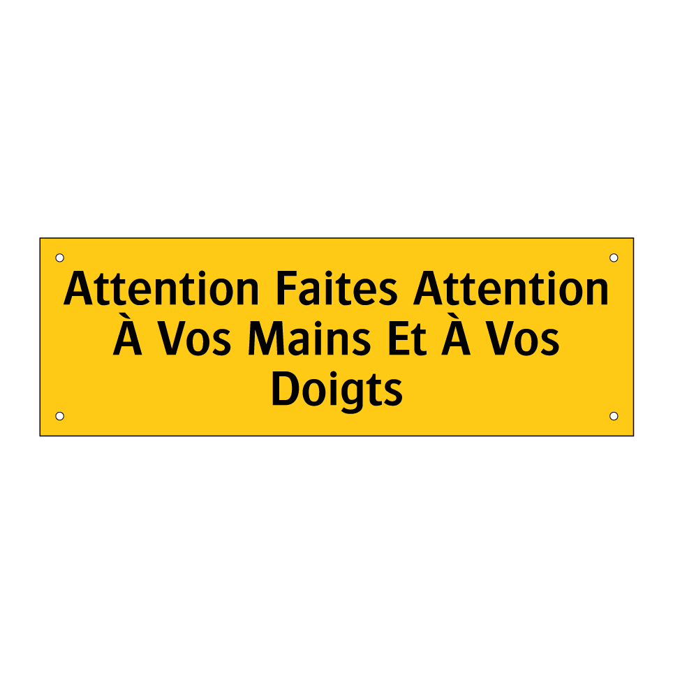 Panneau d'avertissement avec le texte : "Attention Faites Attention À Vos Mains Et À Vos Doigts"