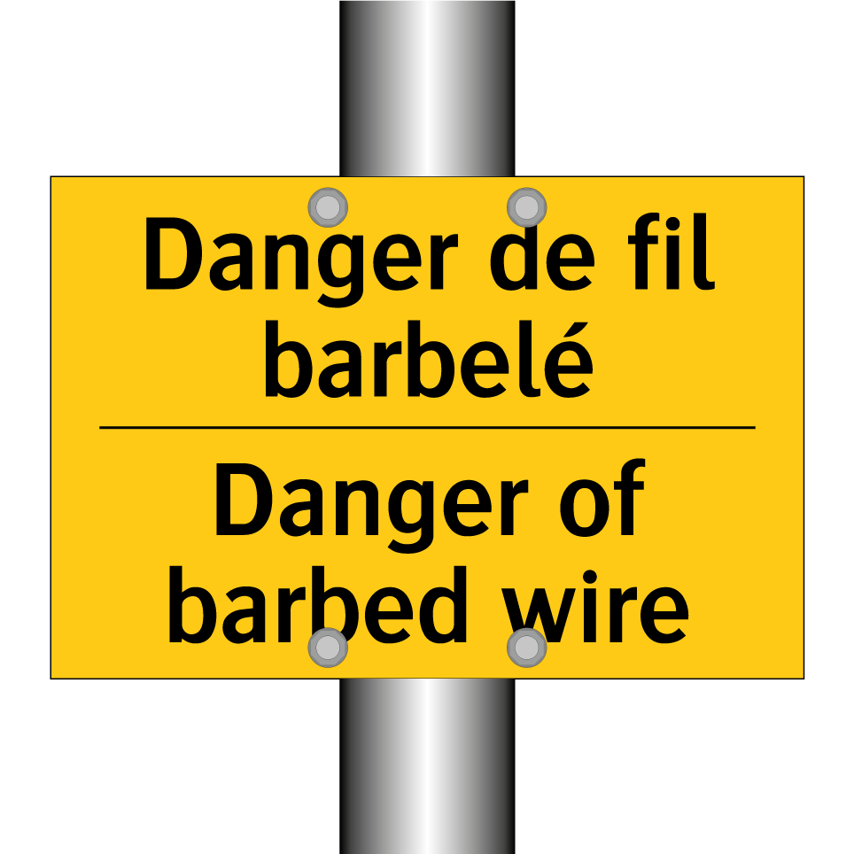 Panneau d'avertissement bilingue avec texte en français : "Danger de fil barbelé", et en anglais : "Danger of barbed wire"