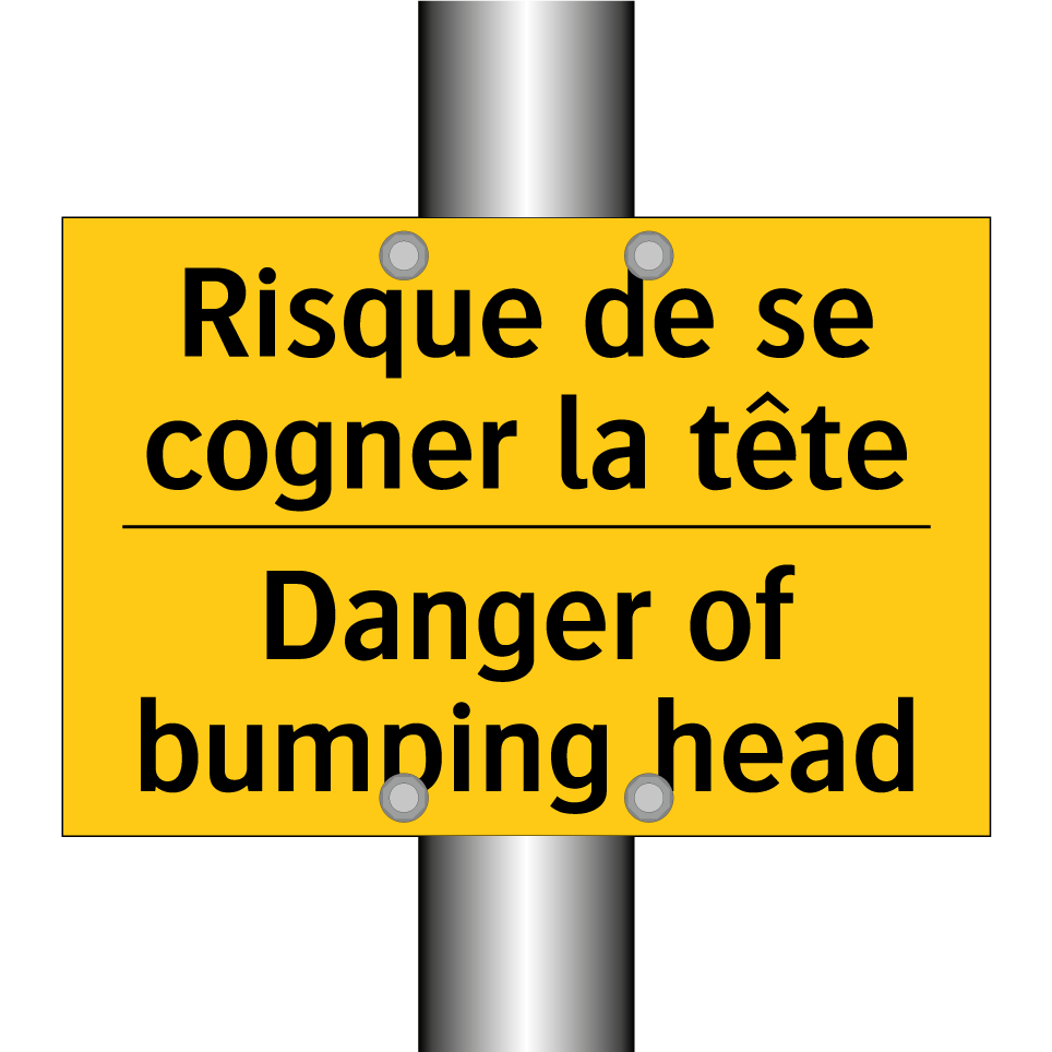 Panneau d'avertissement bilingue avec texte en français : "Risque de se cogner la tête", et en anglais : "Danger of bumping head"