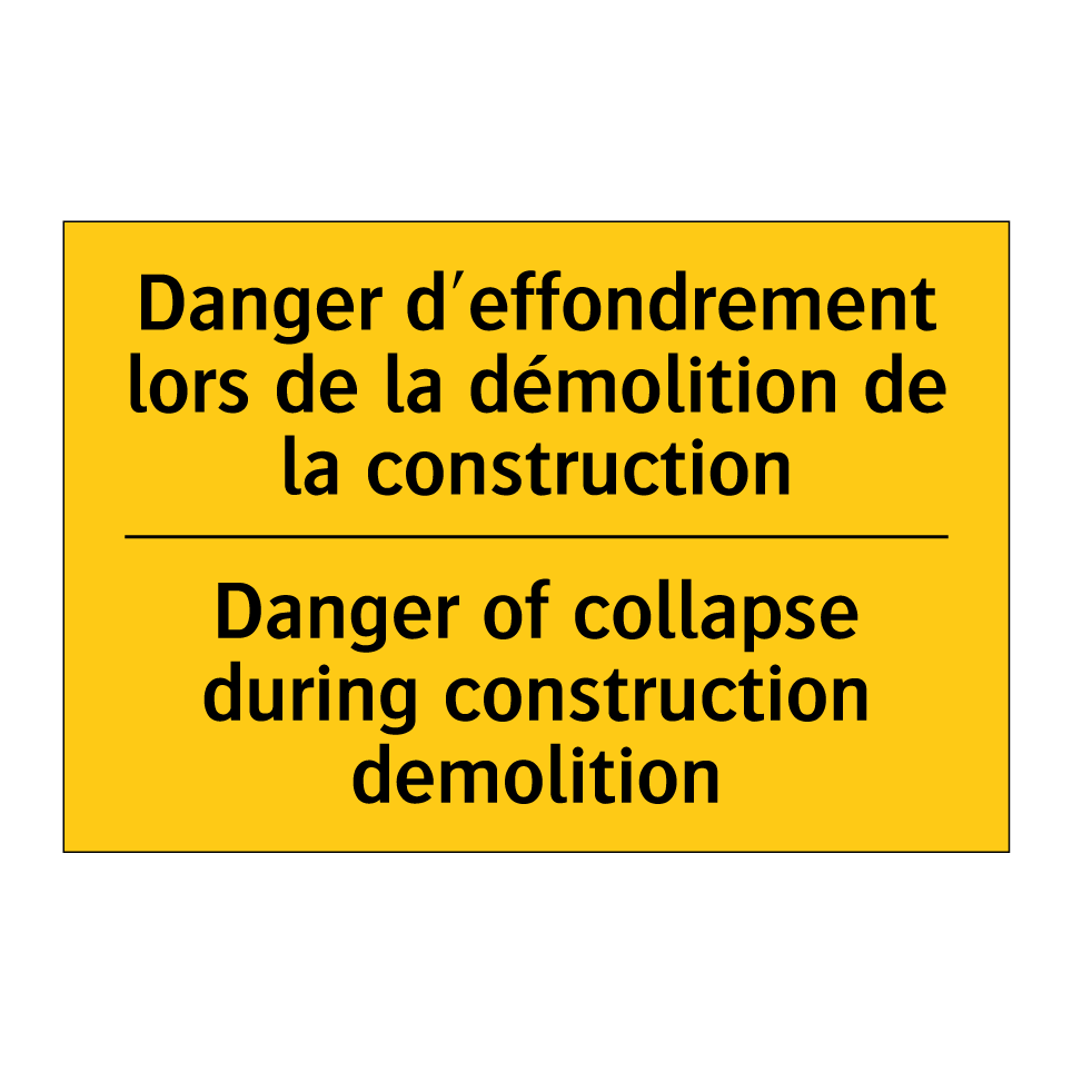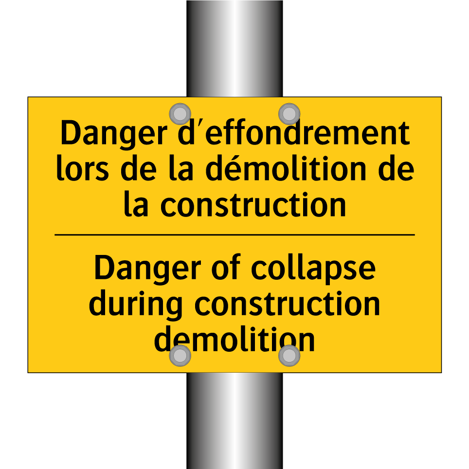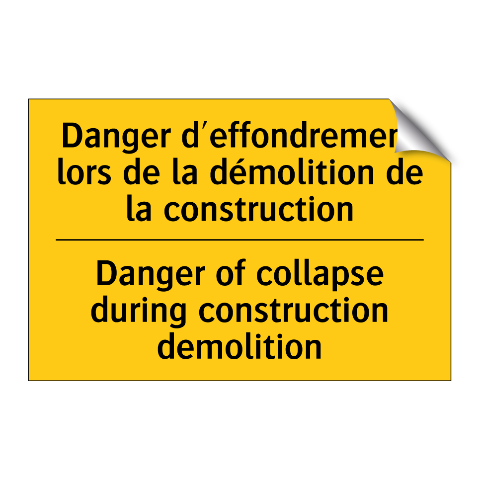 Panneau d'avertissement bilingue avec texte en français : "Danger d'effondrement lors de la démolition de la construction", et en anglais : "Danger of collapse during construction demolition"