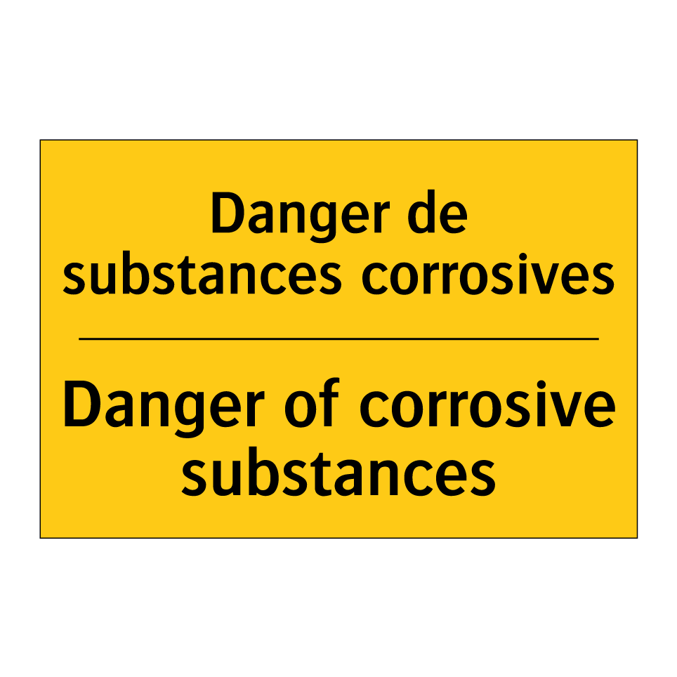 Panneau d'avertissement bilingue avec texte en français : "Danger de substances corrosives", et en anglais : "Danger of corrosive substances"