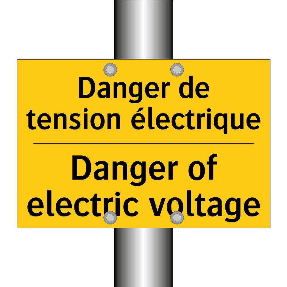 Panneau d'avertissement bilingue avec texte en français : "Danger de tension électrique", et en anglais : "Danger of electric voltage"