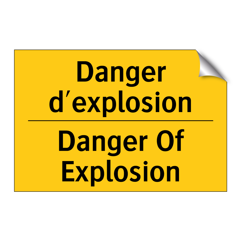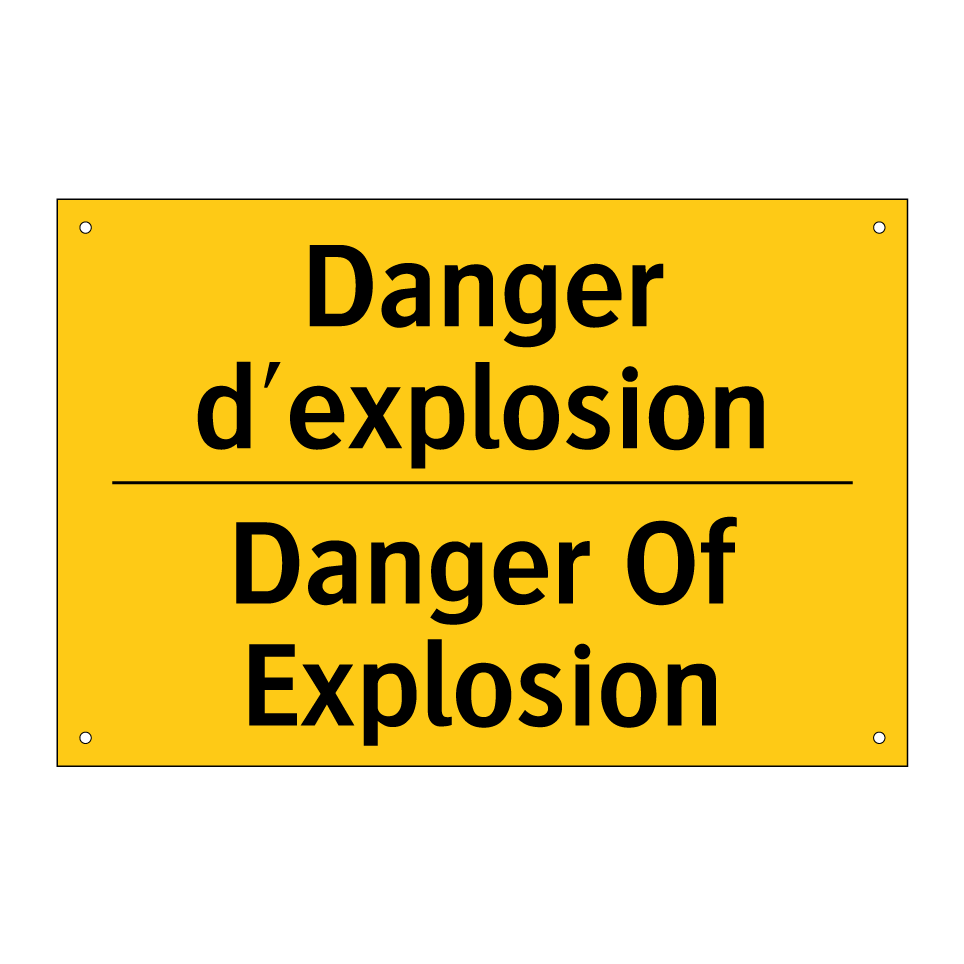 Panneau d'avertissement bilingue avec texte en français : "Danger d'explosion", et en anglais : "Danger Of Explosion"