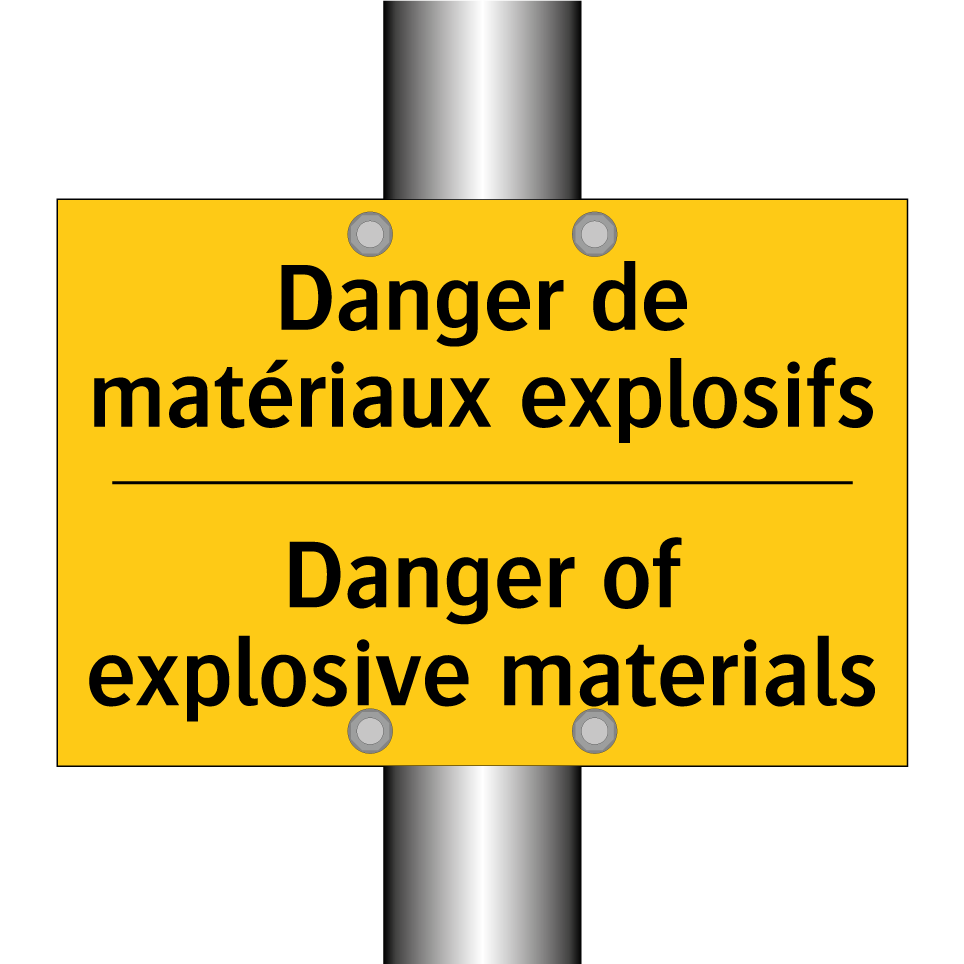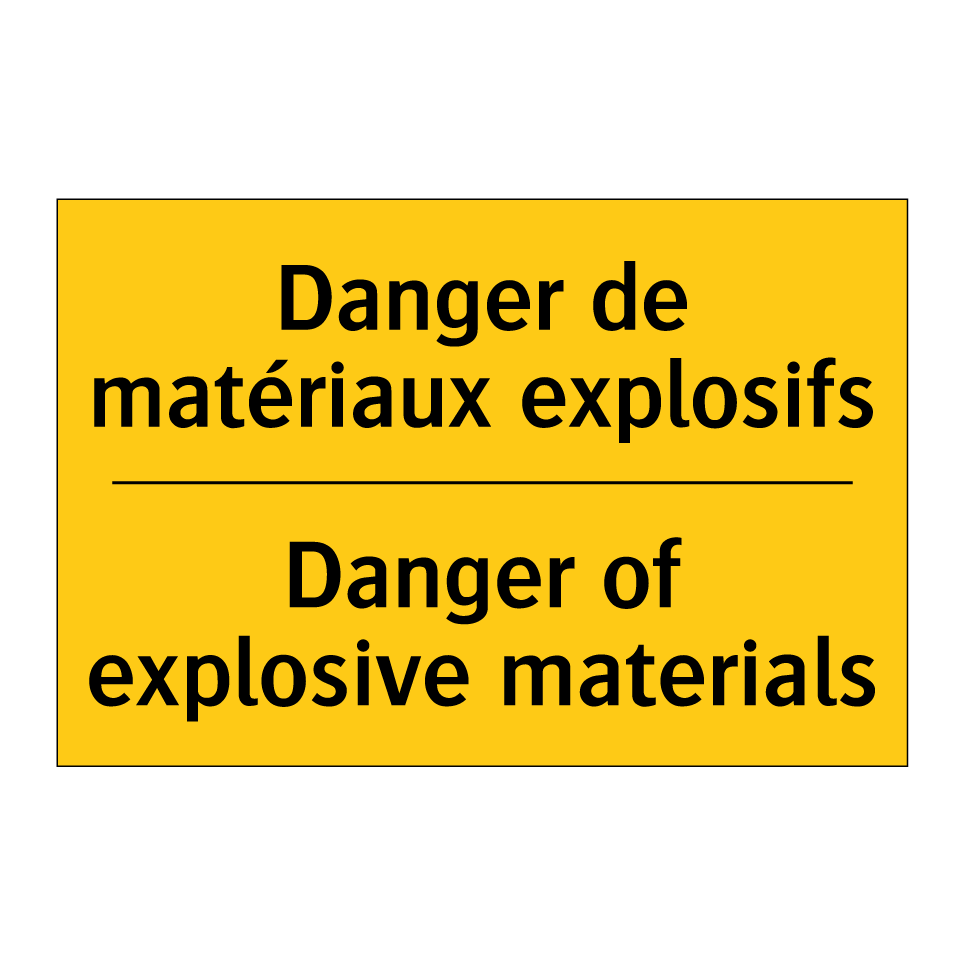 Panneau d'avertissement bilingue avec texte en français : "Danger de matériaux explosifs", et en anglais : "Danger of explosive materials"