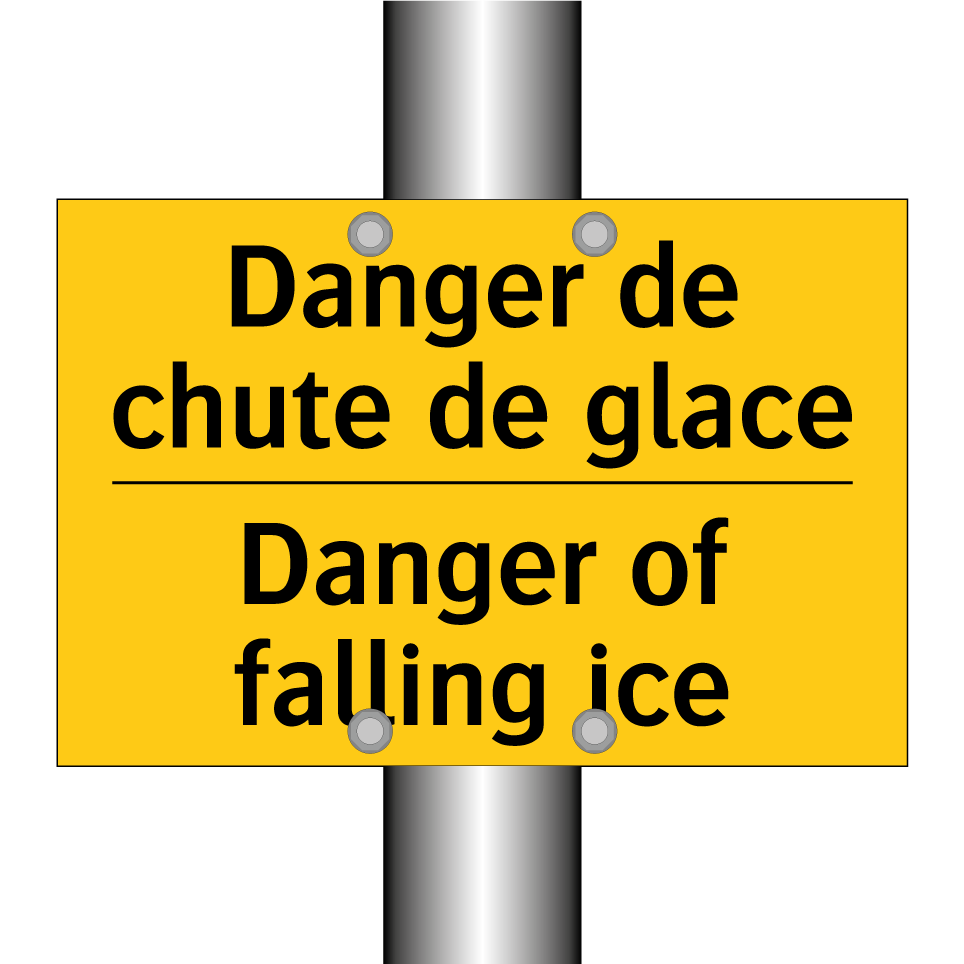 Panneau d'avertissement bilingue avec texte en français : "Danger de chute de glace", et en anglais : "Danger of falling ice"