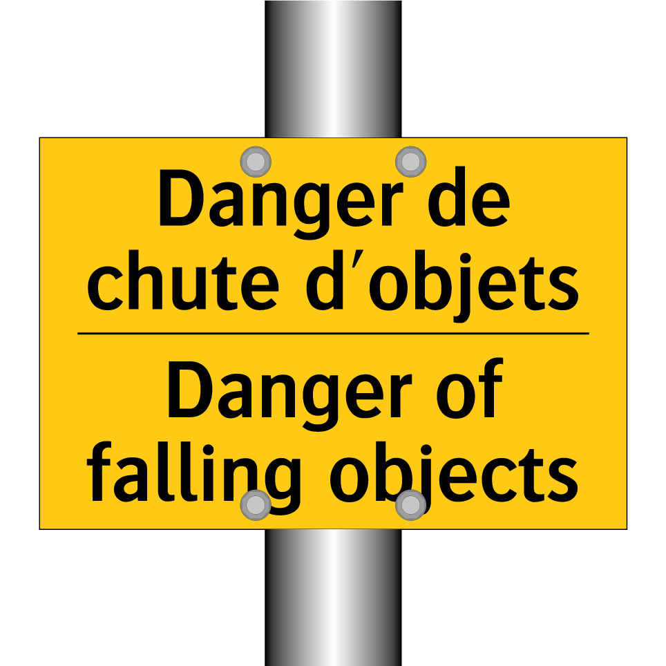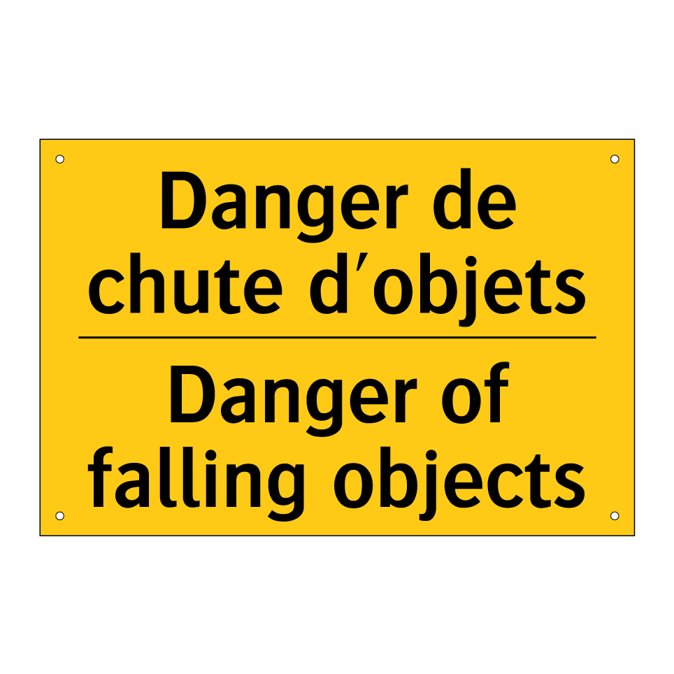 Panneau d'avertissement bilingue avec texte en français : "Danger de chute d'objets", et en anglais : "Danger of falling objects"